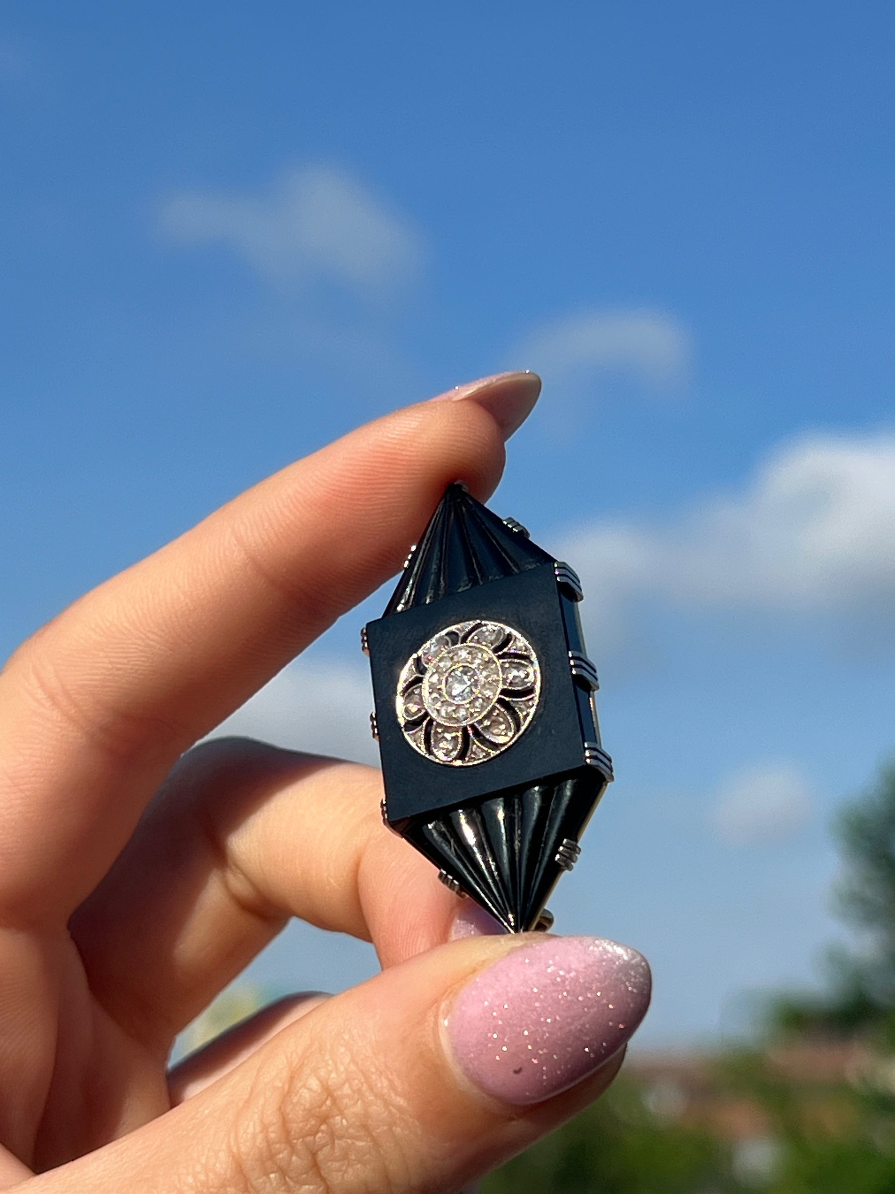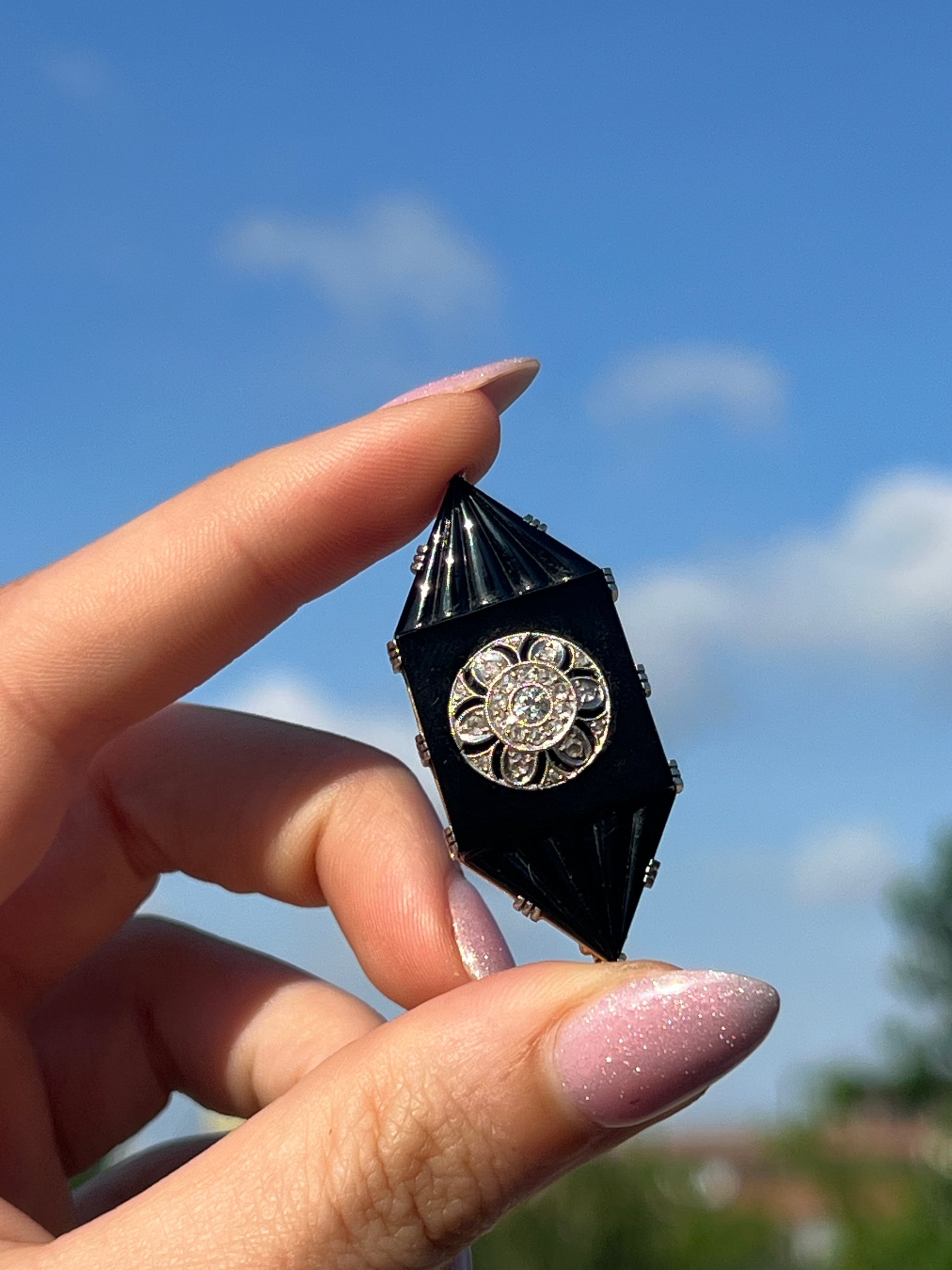 Magnificent and glamorous! Crafted circa 1920’s, this diamond and onyx brooch is a lovely example of the iconic Art Deco design. Set in 18 carat gold, this brooch features heavy geometric shapes and an exquisite level of detail.
