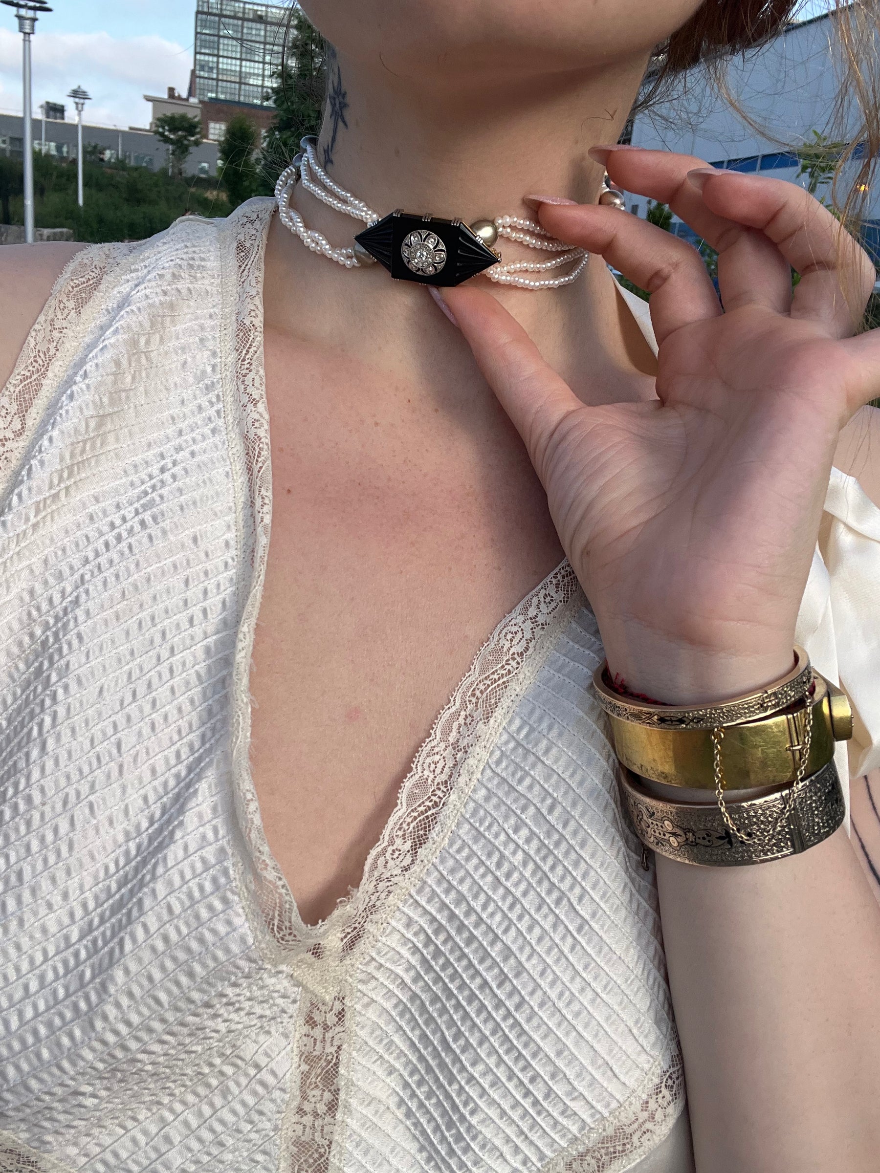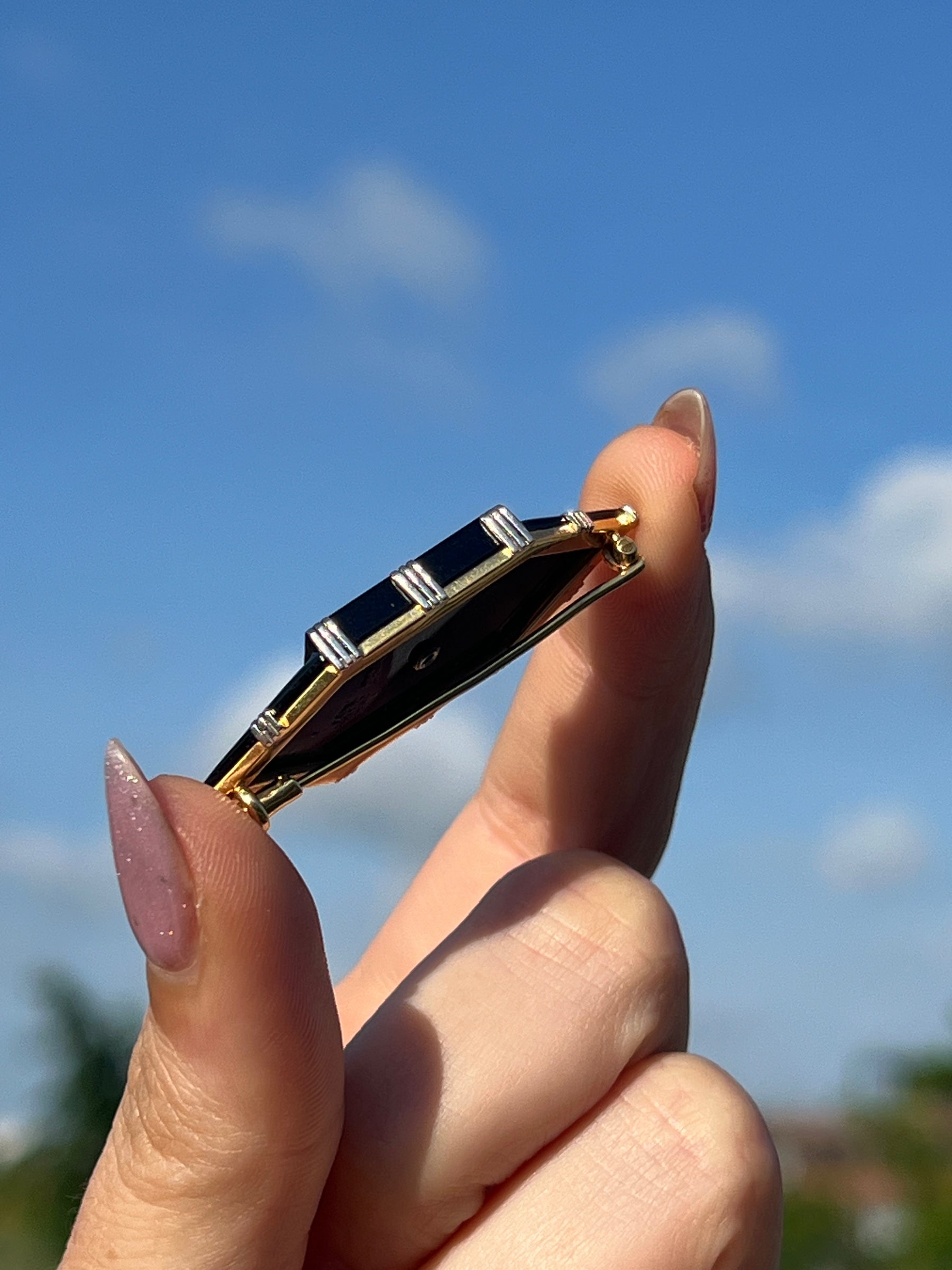 Just look at that onyx setting – the color is rich, deep, and striking – and creates a lovely juxtaposition against the delicate raised metallic grooves dotting the corners of the brooch. Also stunning is the cluster of vivid white diamonds in the center, arranged in a sweet flower petal shape. The center diamond is old euro cut, with rose-cut diamonds surrounding in a halo.