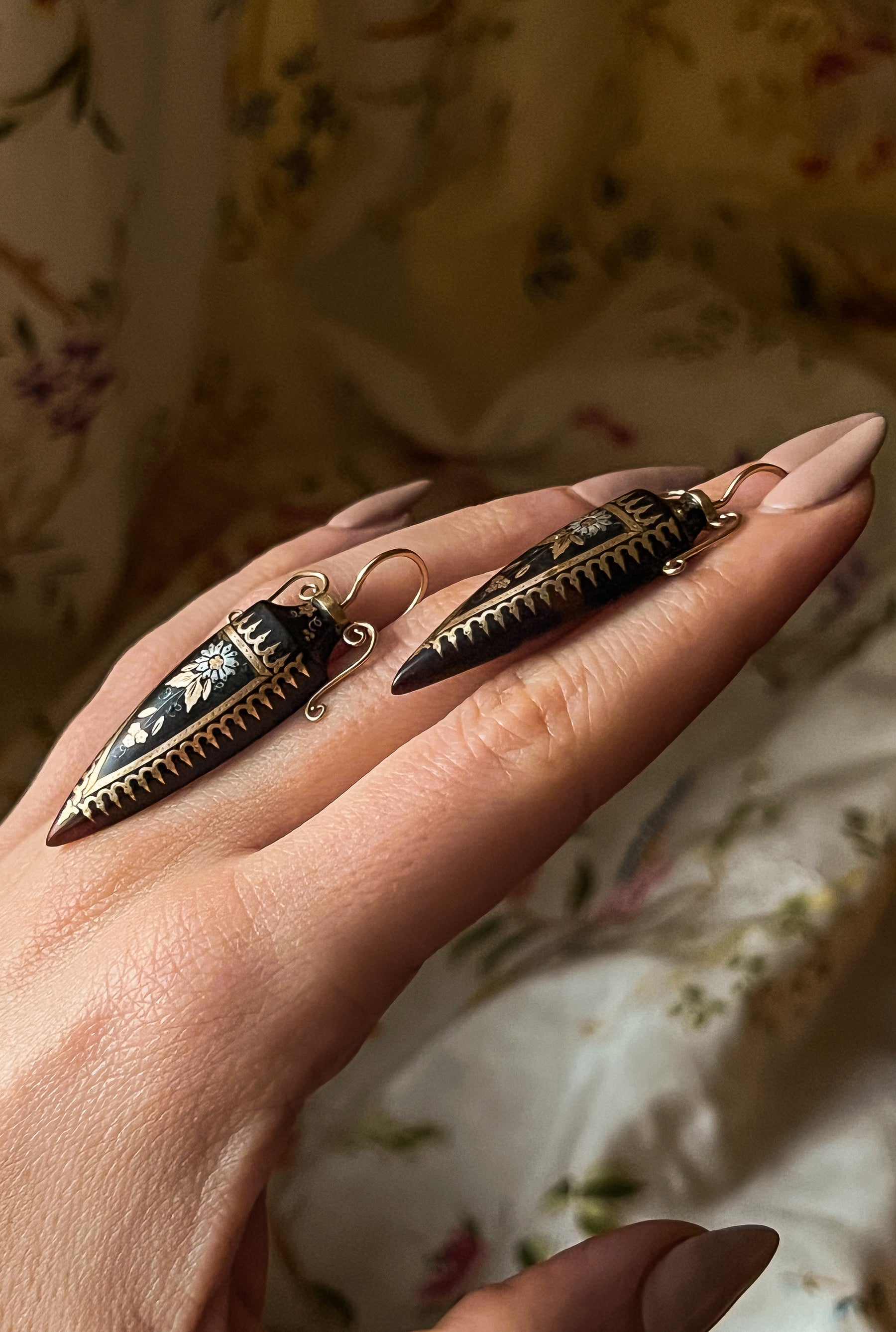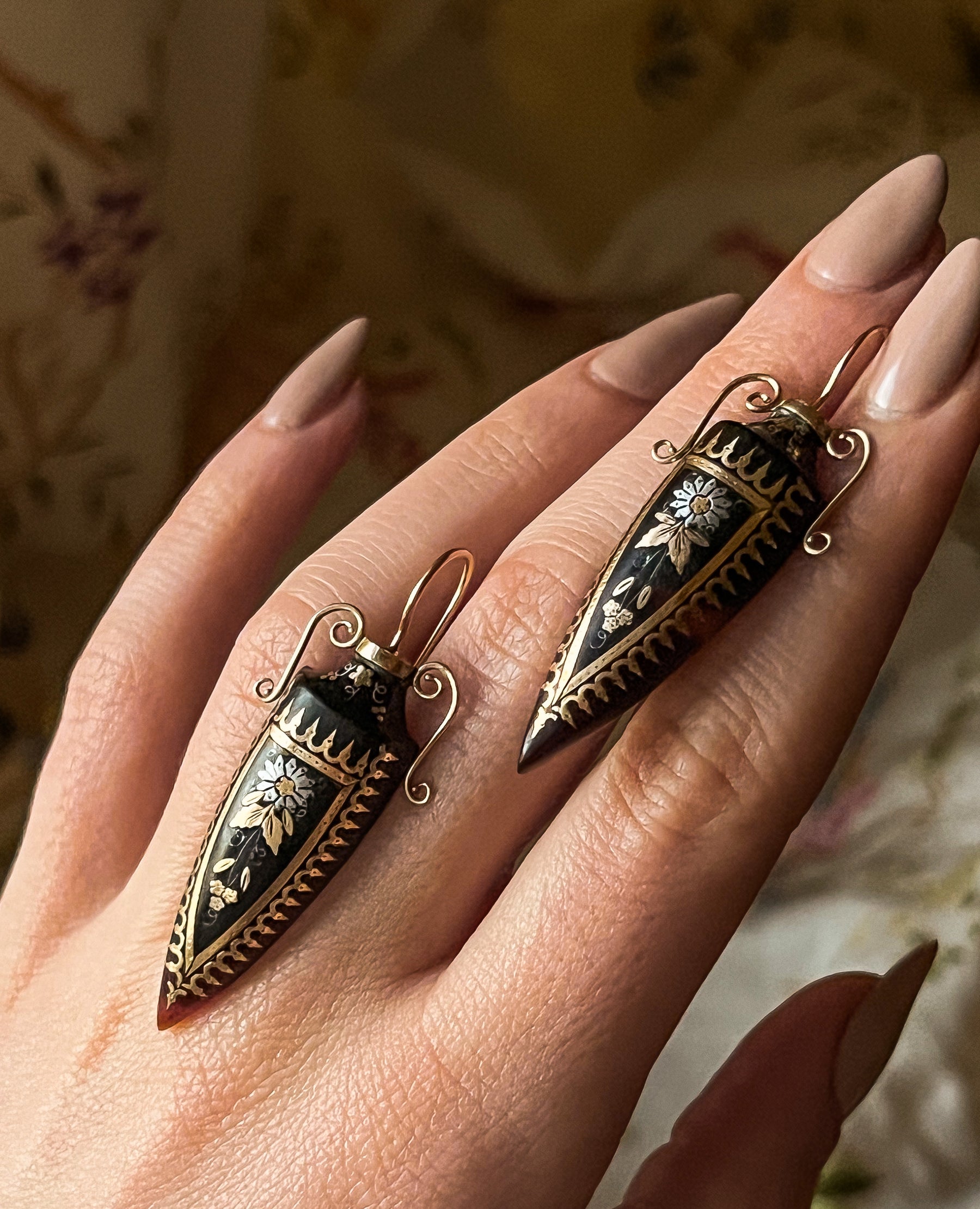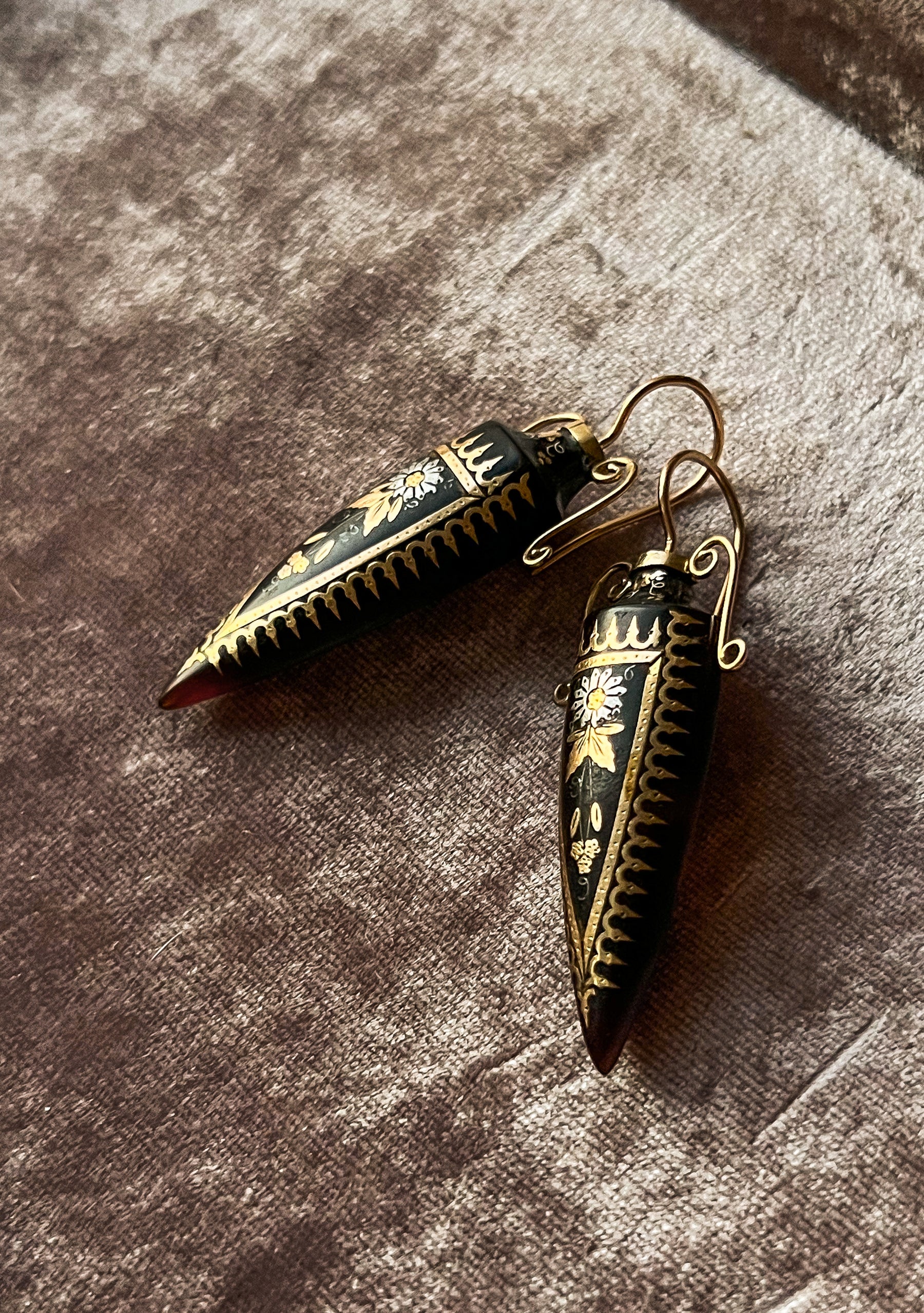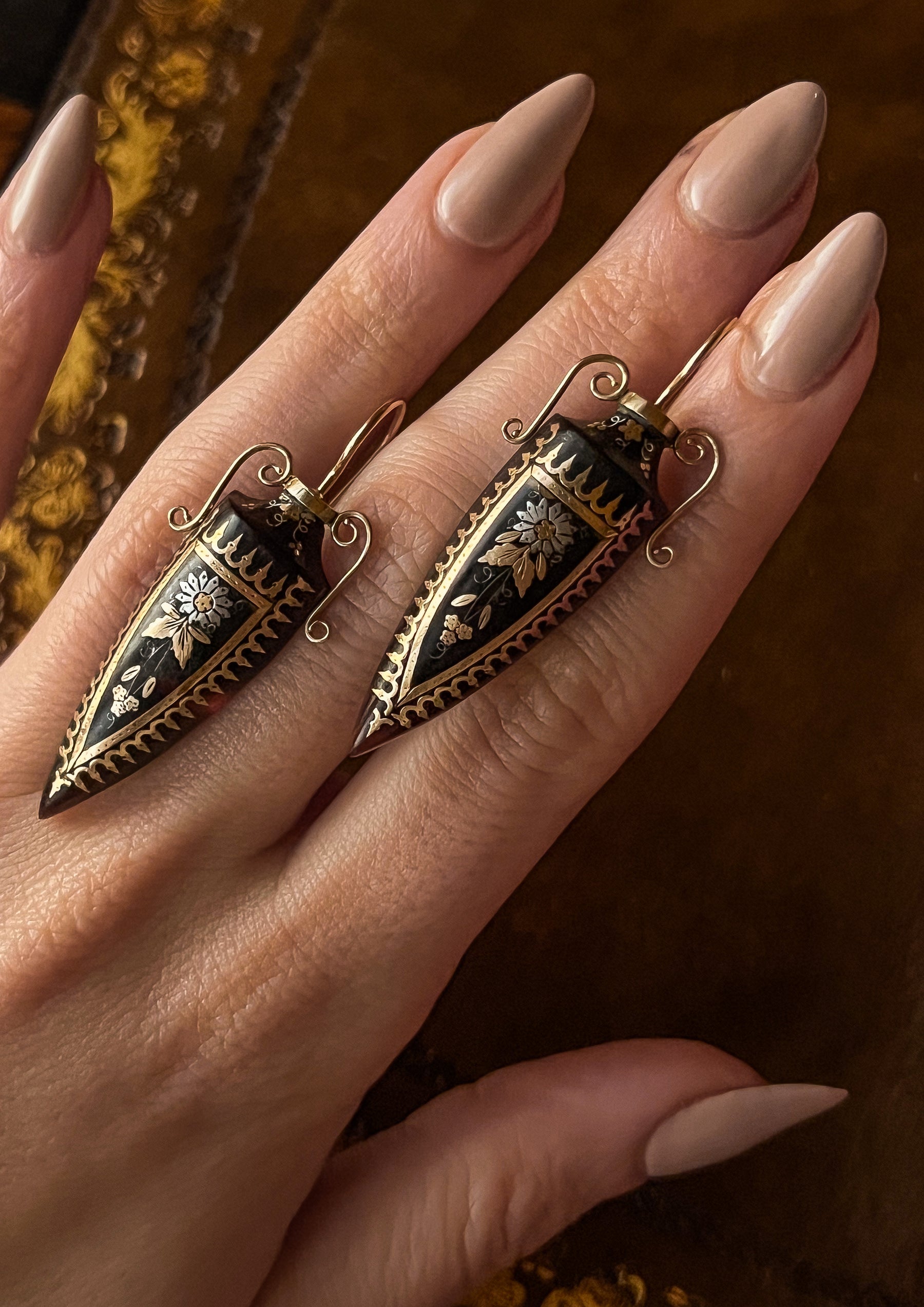 Once in a blue moon, we encounter an object so rare, it simply takes our breath away, and this rare pair of Archaeological revival amphorae earrings are just that. Beloved by all, the amphora has been a prolific jewelry motif since the ancient world. Didn’t you know? All the Hellenistic it girls had that comically representative jewelry ON! Thankfully for us, the style was meticulously revived in the 19th c, spurred by archeological digs and the new discoveries of the Rosetta Stone, the tomb of Tutankhamen in the Valley of the Kings, and the excavation of the Pyramids at Giza at the beginning of the century.