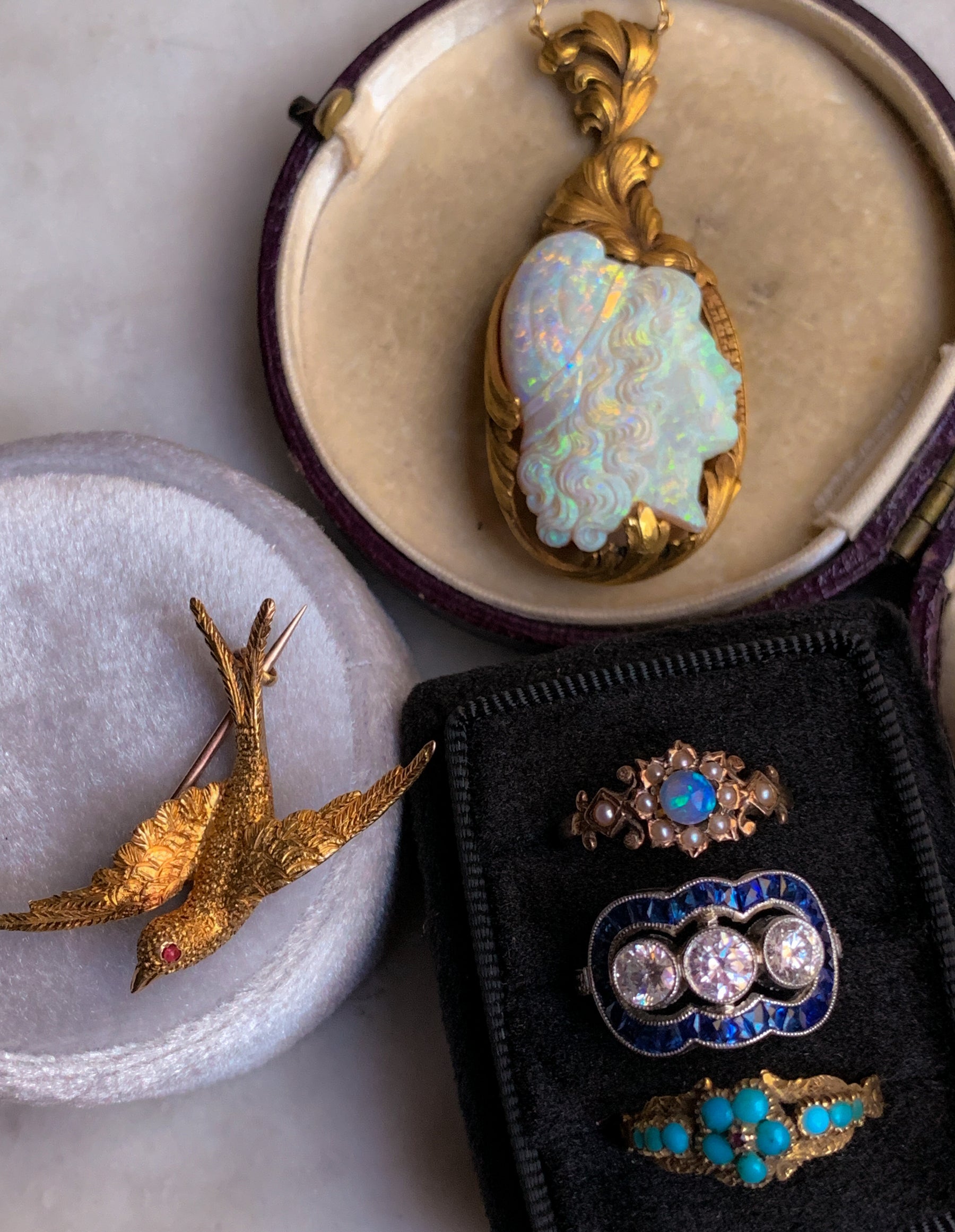 Please view and inspect any photos closely. We endeavor to fully disclose all condition information clearly and concisely, however, please note that what qualifies as excellent condition for historical jewelry differs from modern and contemporary pieces; please take the age of the piece into account when examining the piece. Minor age wear is typical and to be expected for antique and vintage jewelry. Unless otherwise stated, gemstones have not been officially graded for color, clarity, or treatment by GIA; any information provided is our own educated, professional assessment.