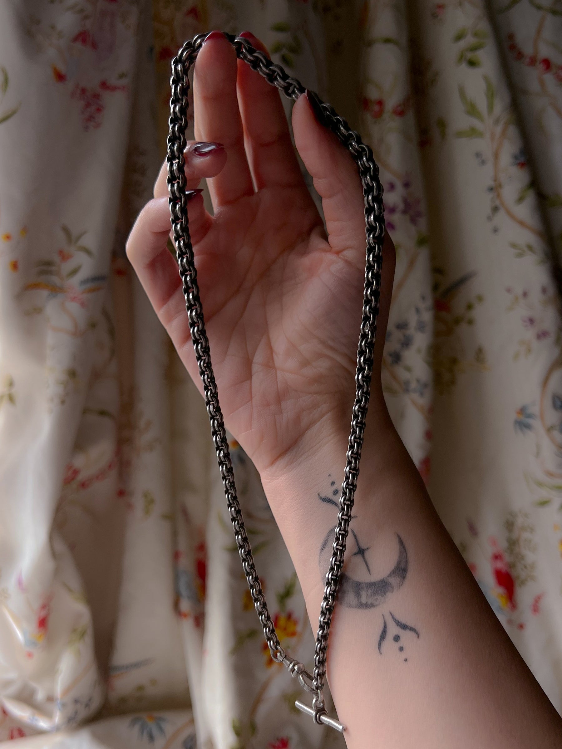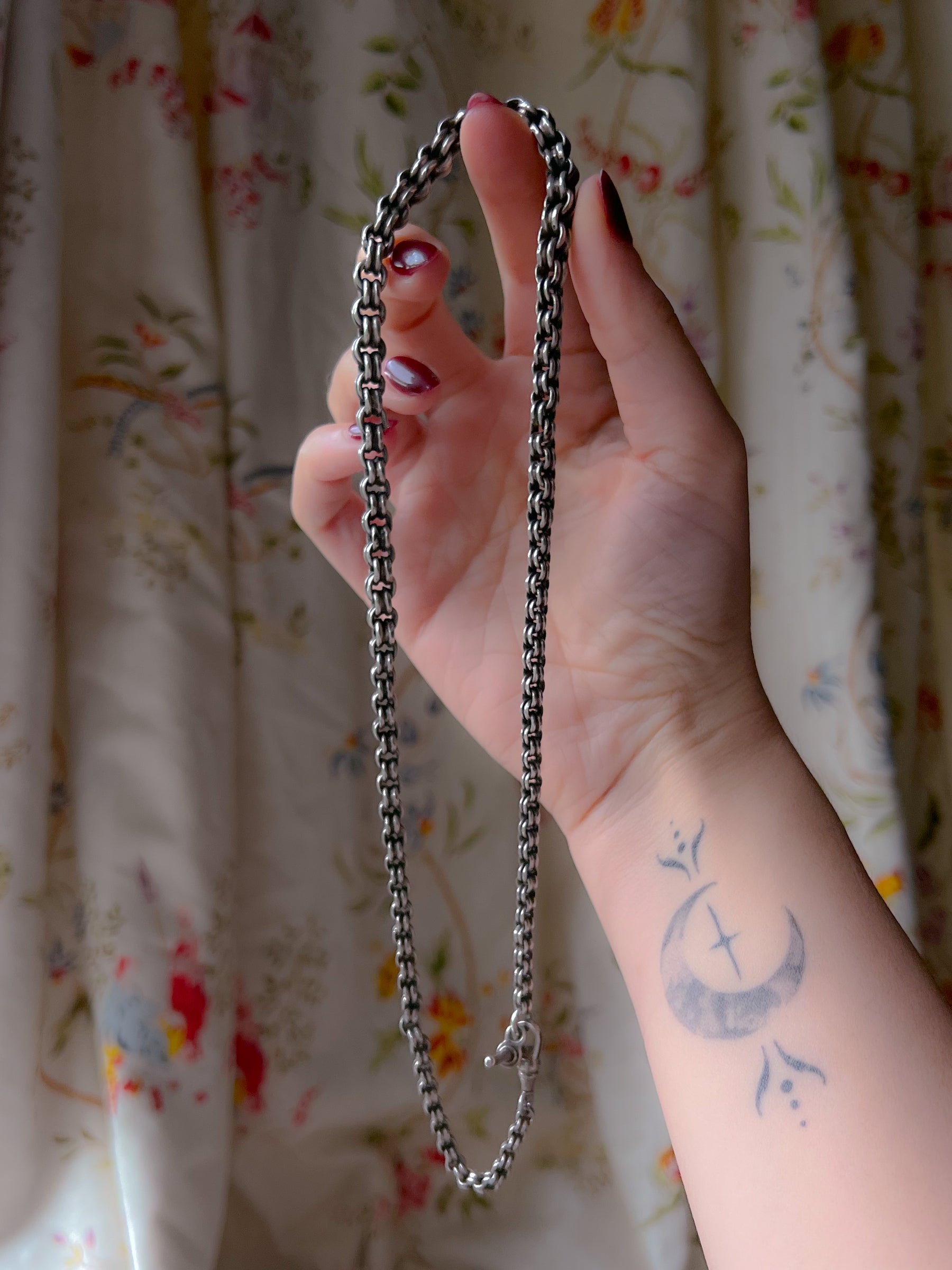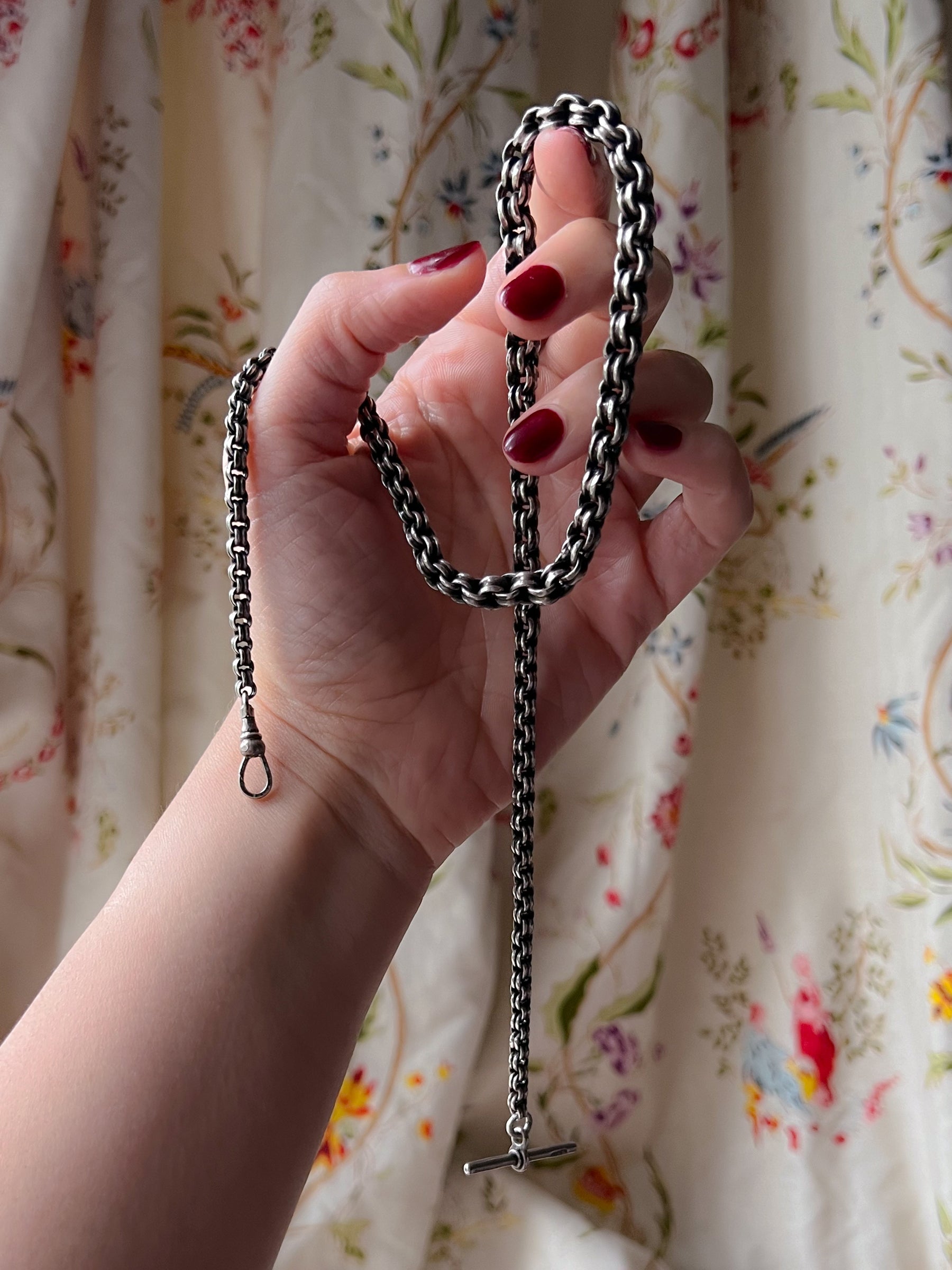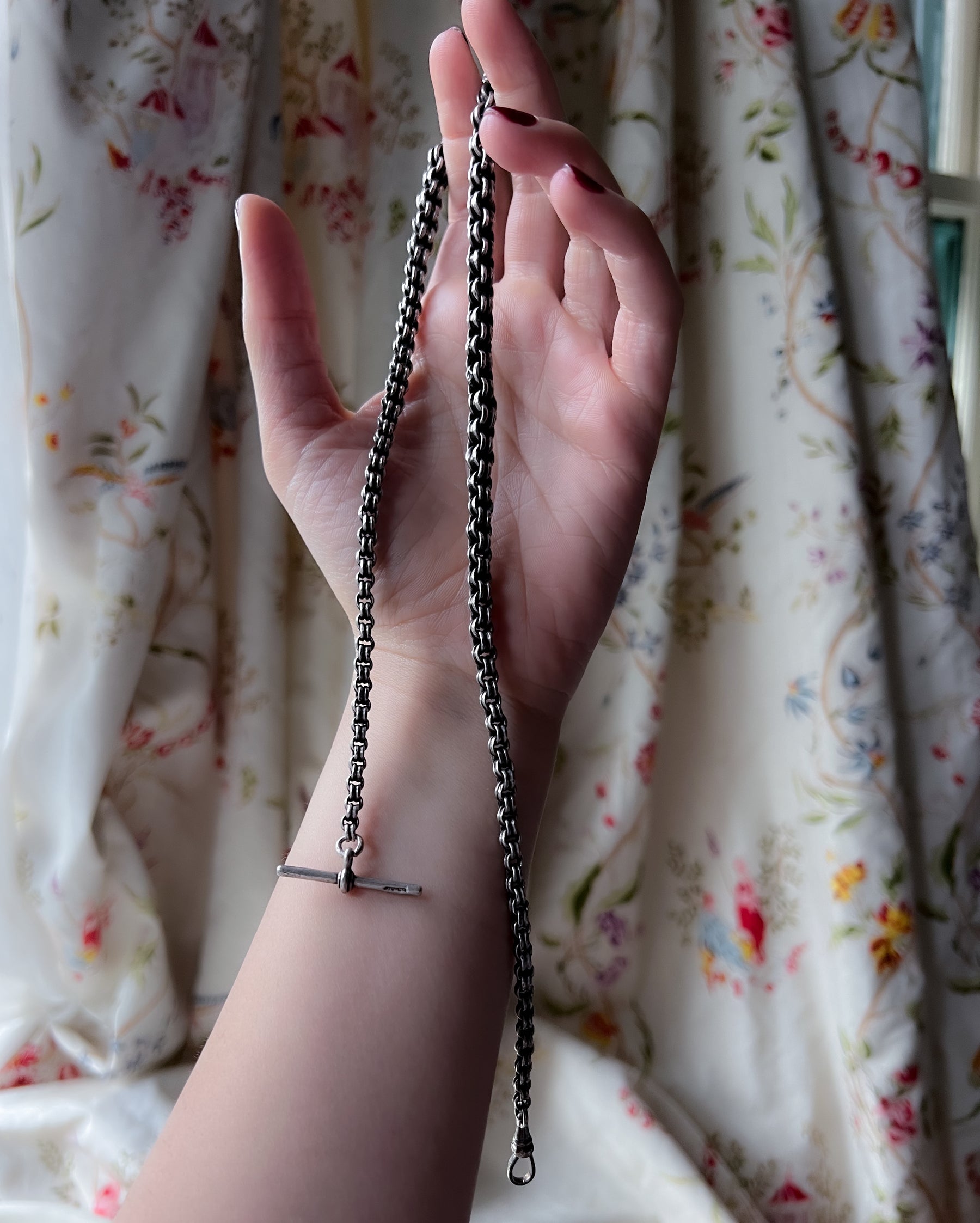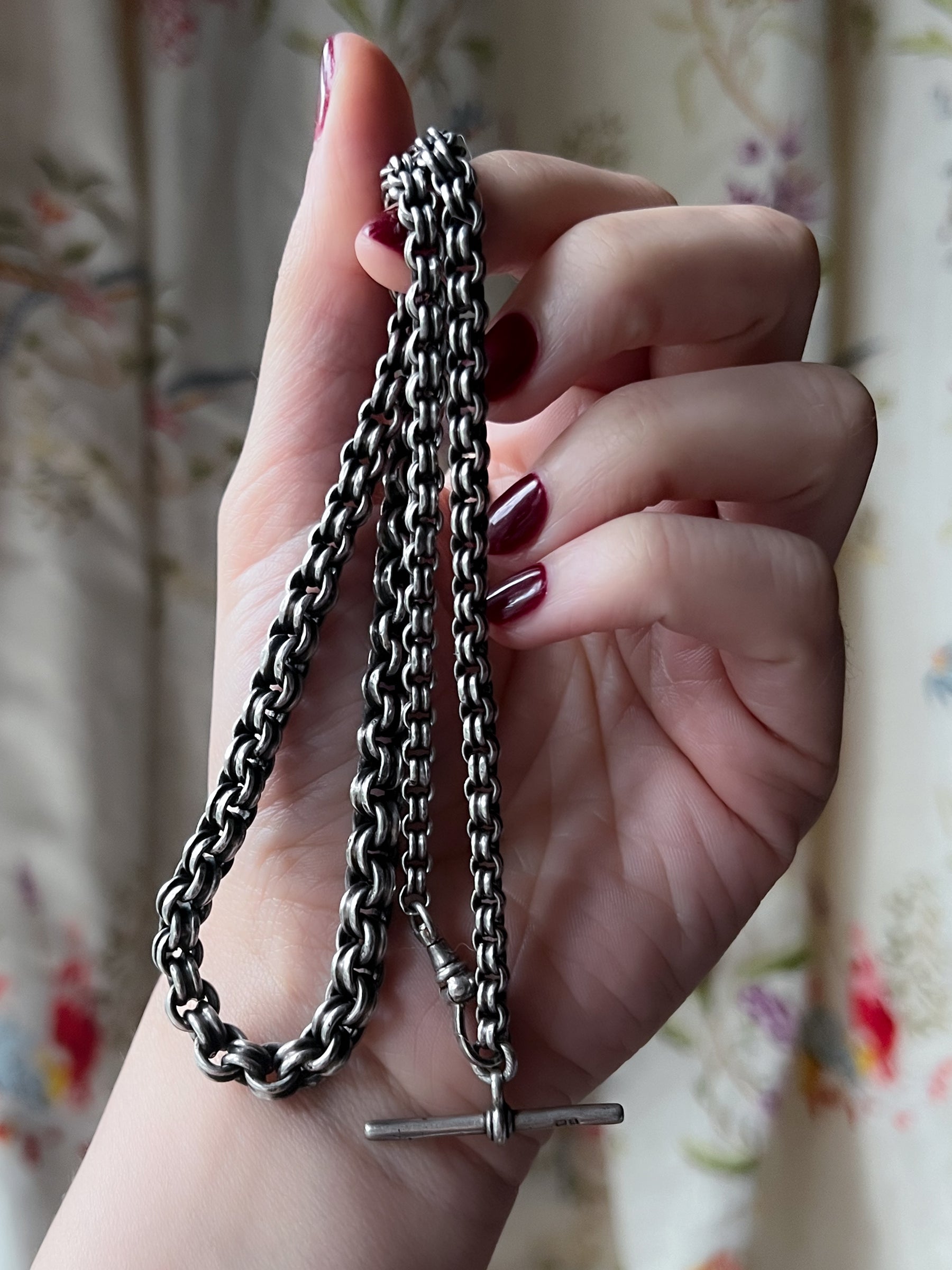 A substantial archaeological revival chain with hundreds of hand wrought links that create wonderful interlocked spheres of sterling, this gorgeous English chain has the most sensual feel to it. Drawing from both Roman Fibulae in construction, and the tradition of Etruscan jewelry that was being ravenously copied and revived in the mid 19th century, this chain is singular. Larger than usual, the links are 3-8mm in diameter, creating a certain heft within their lightness on the chain and a delicious graduation.