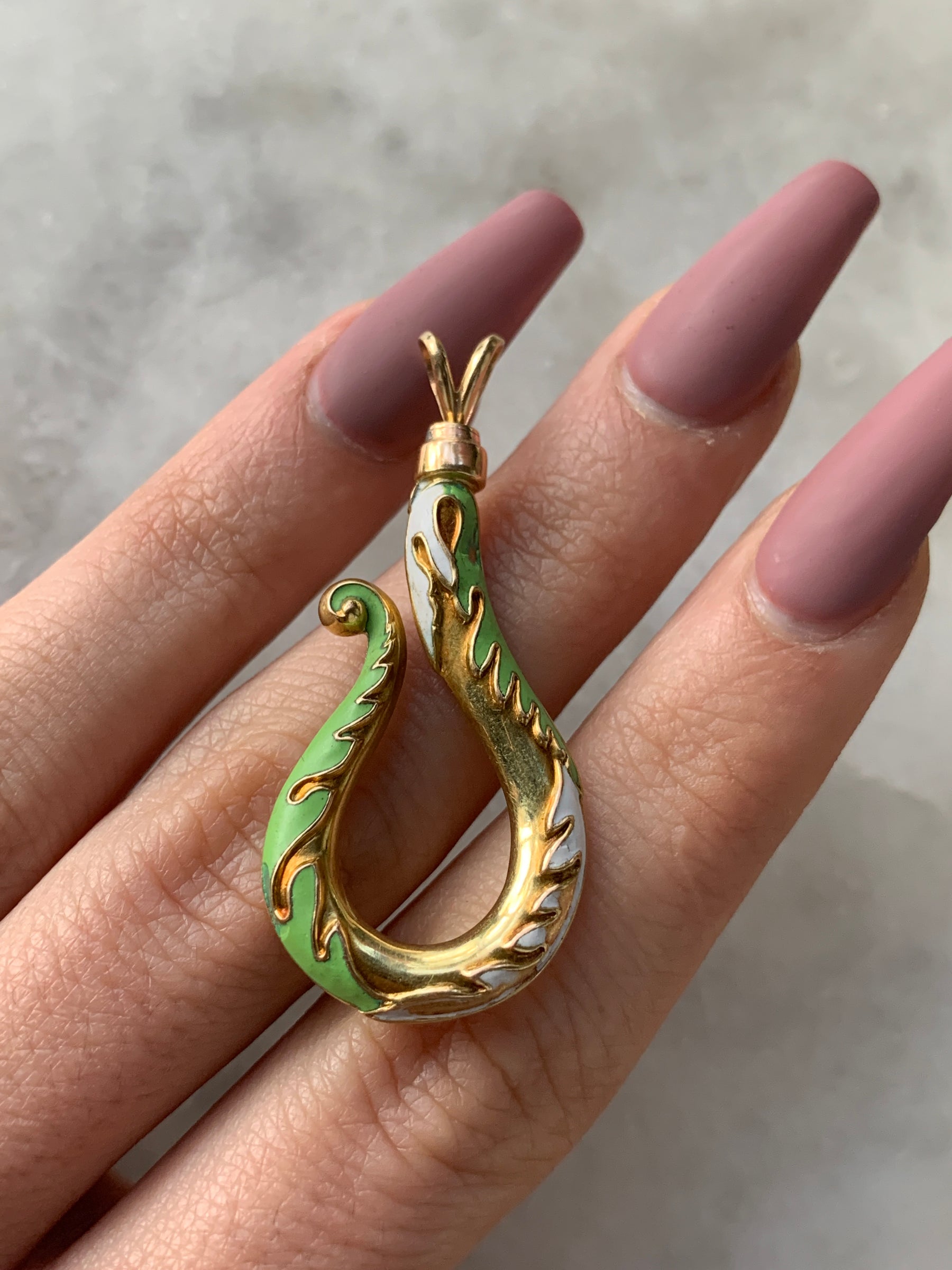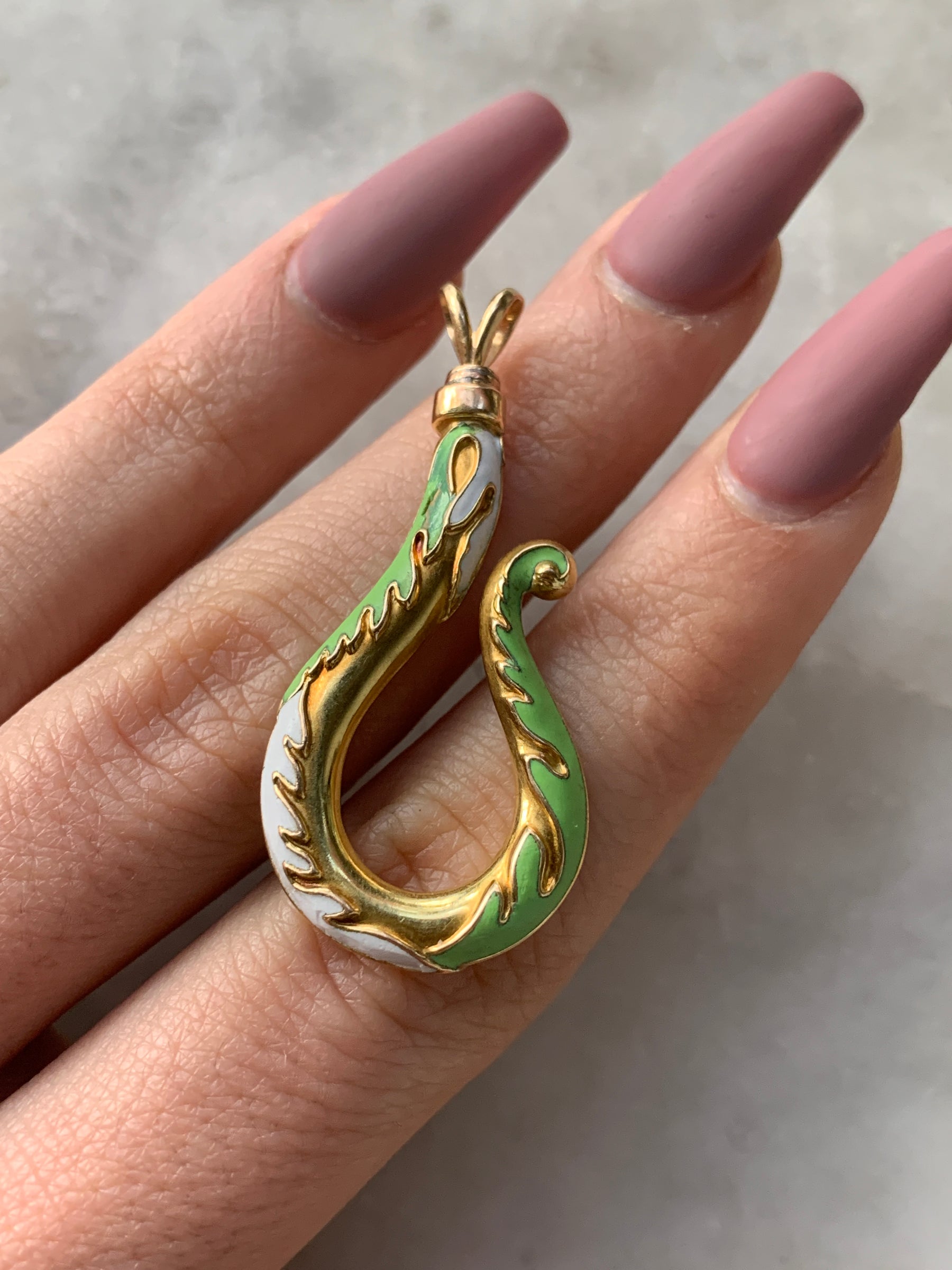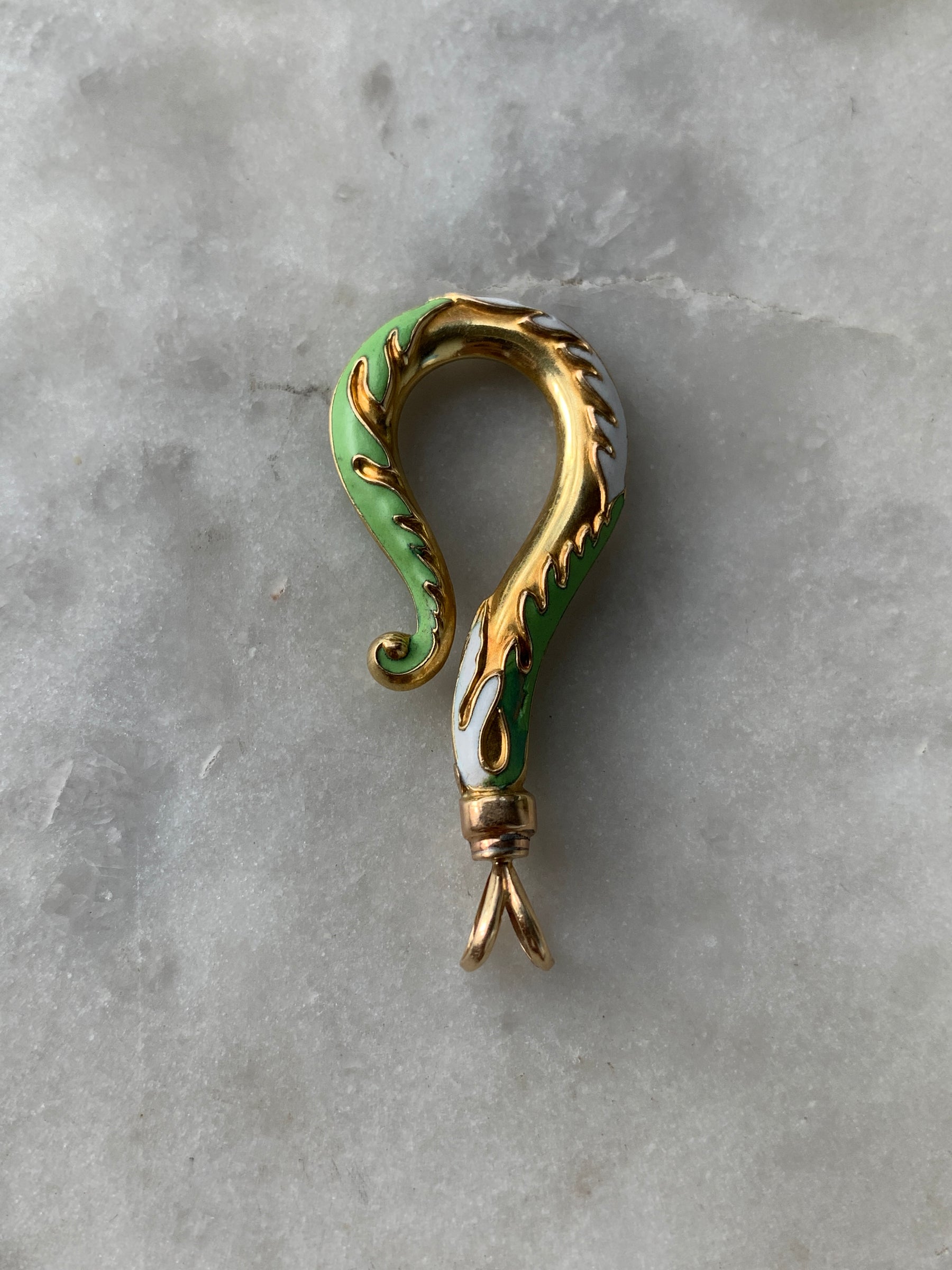 This gorgeous piece is detailed throughout with white and sage enamel,  as well as raised details, and is topped with two small hooks that resemble the tongue of a snake. Add this playful piece to any collection or neck stack - it'll become your new best stacking friend.