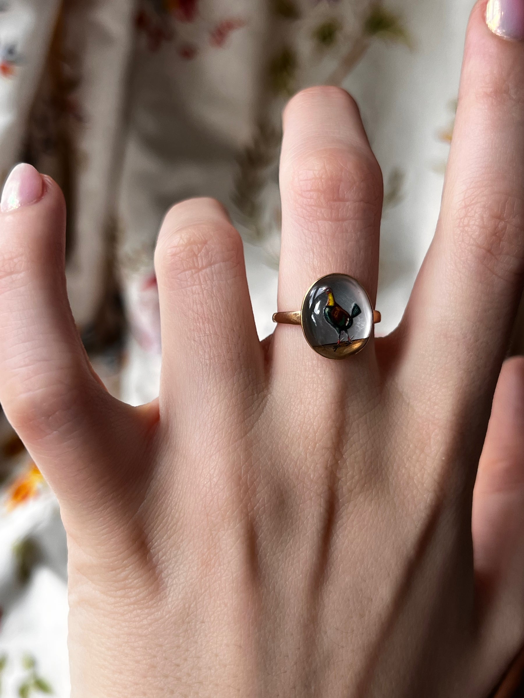 An incredible Victorian essex crystal of a beautiful grouse circa 1890. This extremely fine Essex was created utilizing the classic technique of reverse intaglio rendering; to create the sense of three dimensionality, the subject was carved in intaglio, then painted in reverse, with highlights first, and base colors last. It is then pearled with a thin slab of mother of pearl, and presented inverted, so that a cabochon is cut of the forward facing rock crystal, then set bezeled. This outstanding example shows the most beautiful color and painting of a male grouse with a nearly iridescent body, yellow neck, and brown wings with cropped tail. See image appendix for more.