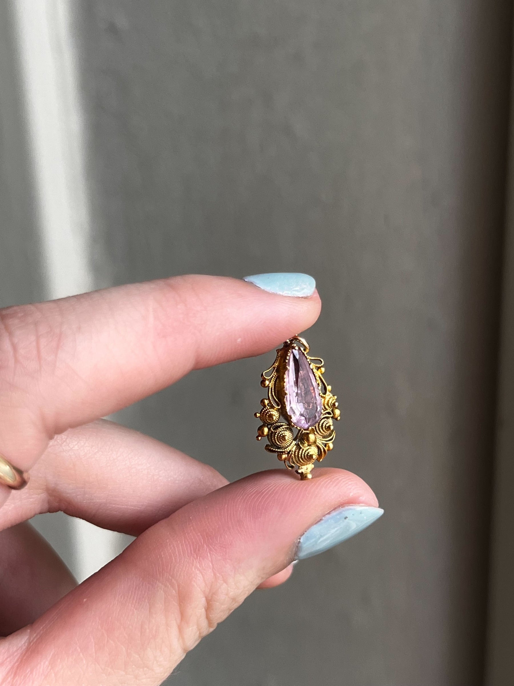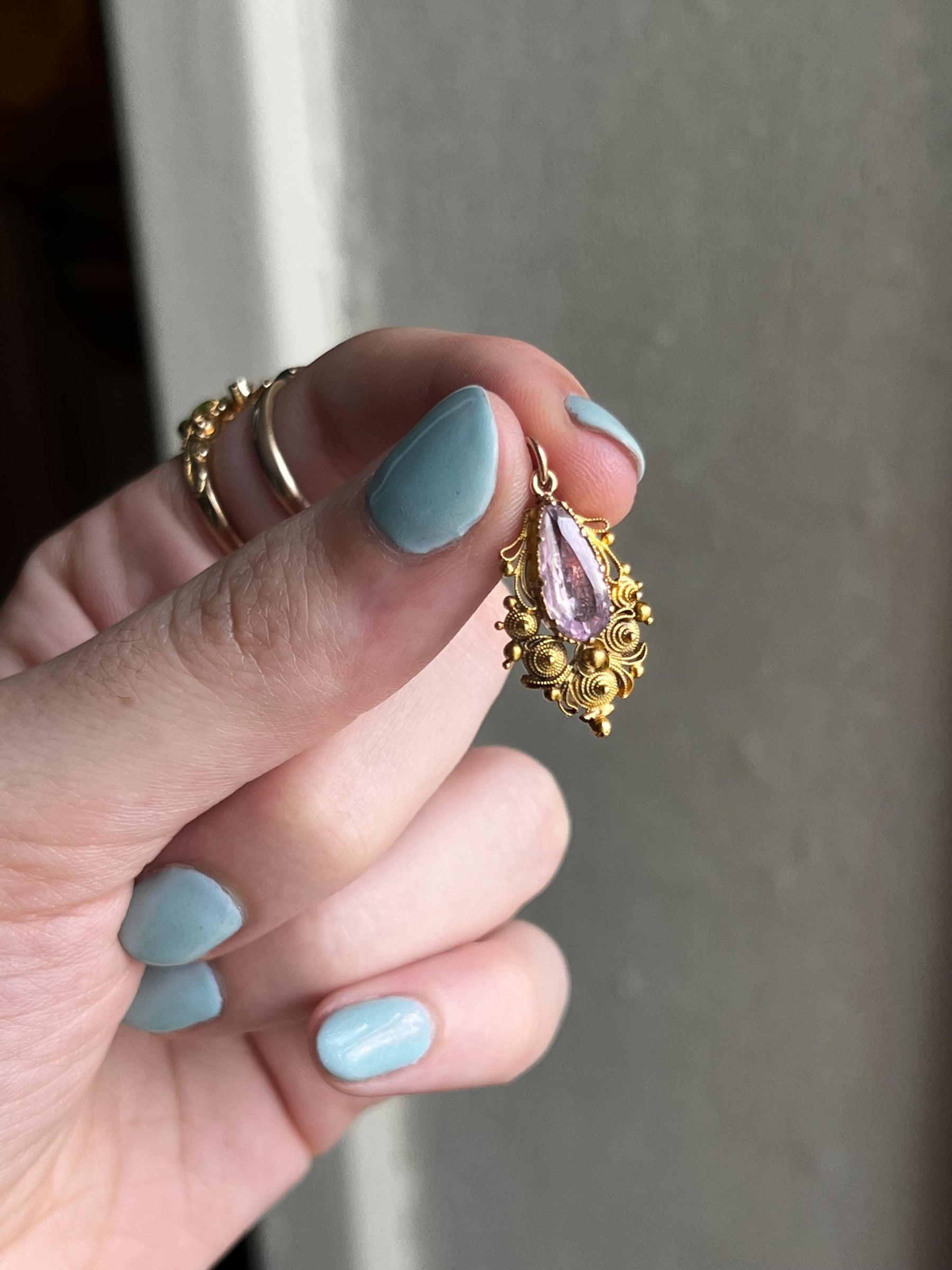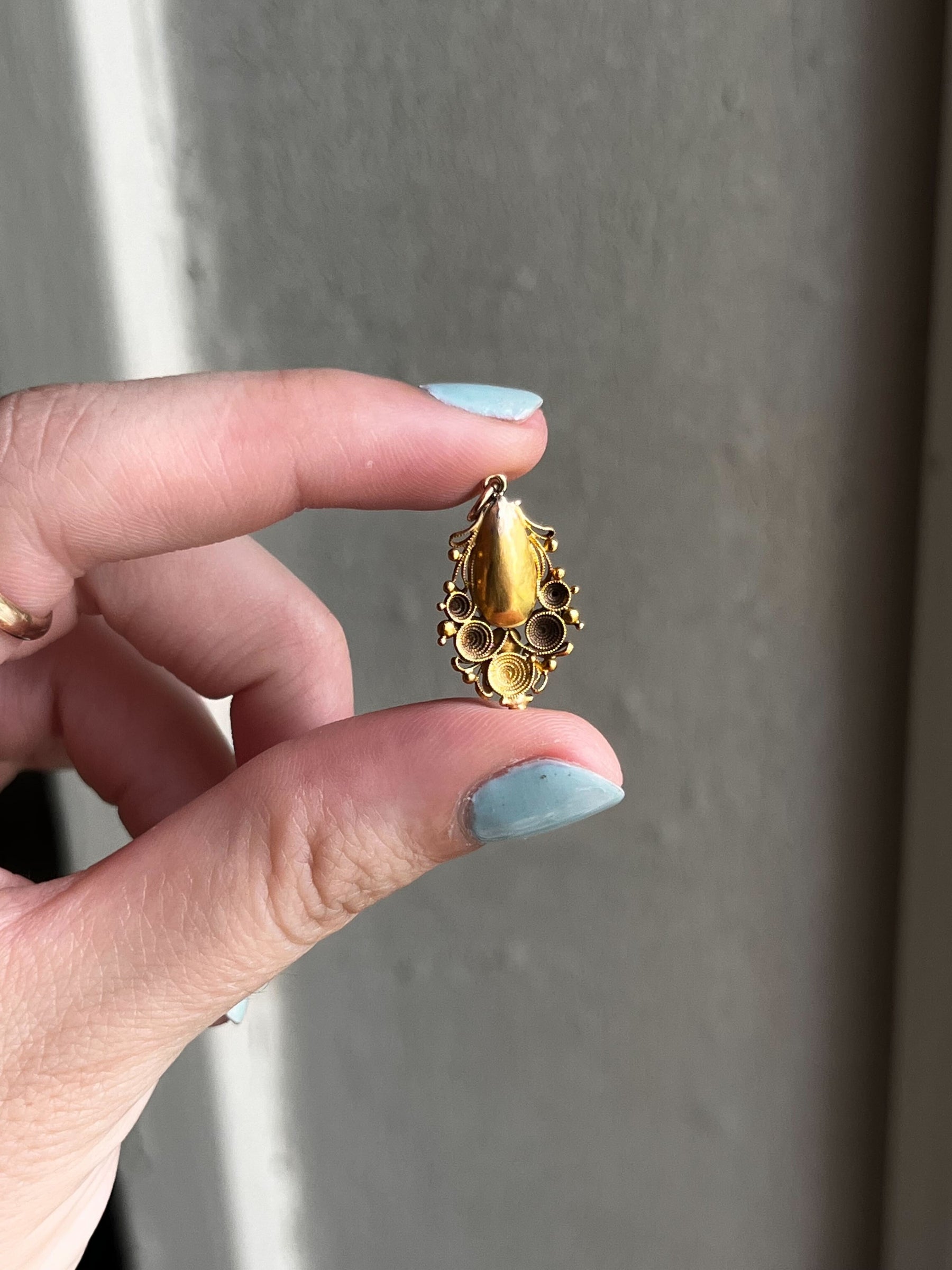Styles were dramatic and ornate during the Georgian period, thanks partly to intricate metalwork techniques such as cannetille (a method of working the gold wire to make it look woven), as we can see in this special pendant. This metalworking technique, very popular in the 1820s and 30s, involved intricate wirework designs. Cannetille resembles embroidery-inspired filigree.