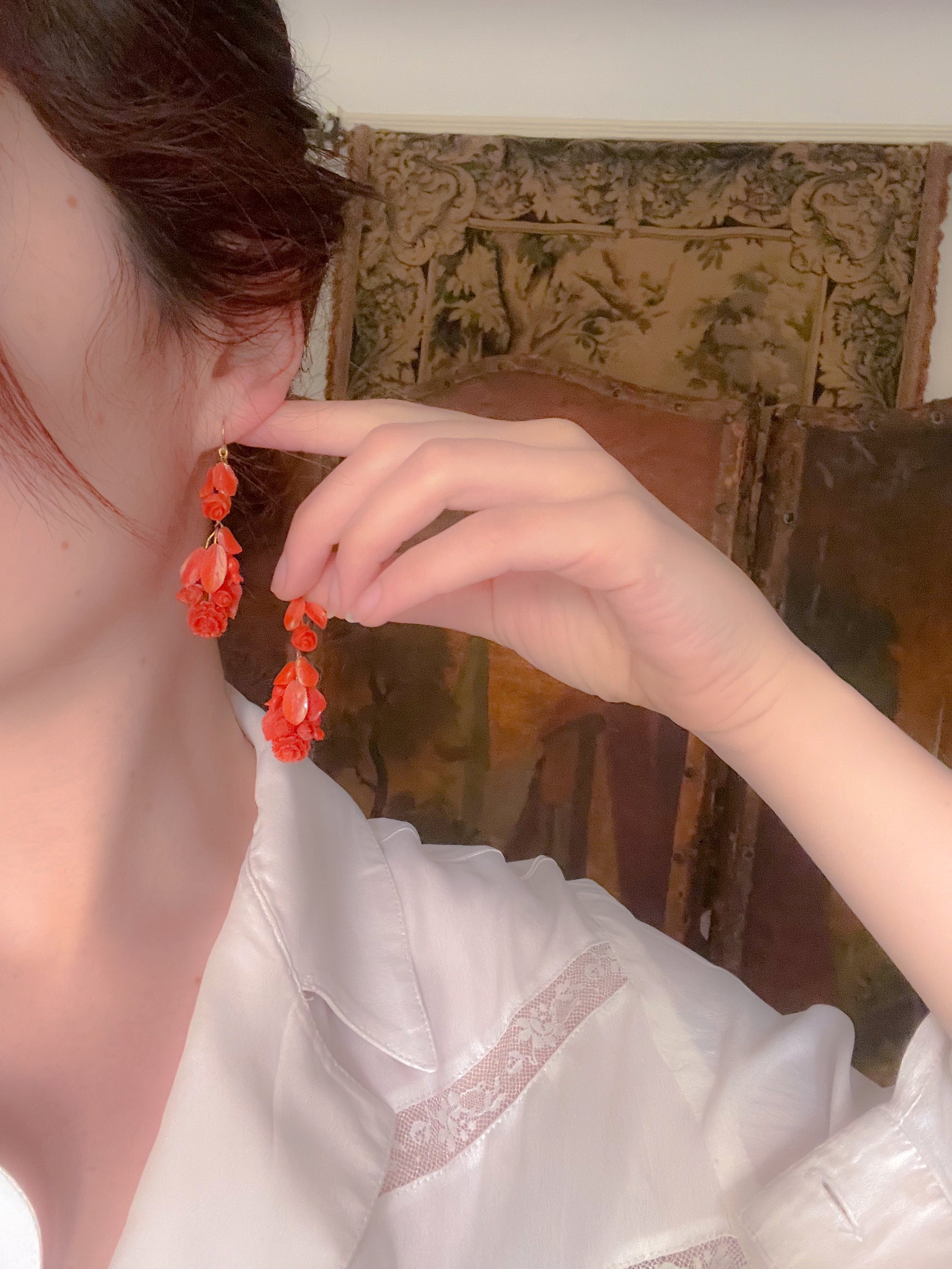 A stunning, French 19th century pair of Coral day/night earrings with detachable coral drops for evening wear, and a sweet rose for daytime wear. These earrings feature a large rose bud at the top, two smaller buds on the long part of the earring, two rose hips, and one large Damascus at the very bottom. An outstanding, all original pair of french 18ct coral earrings.