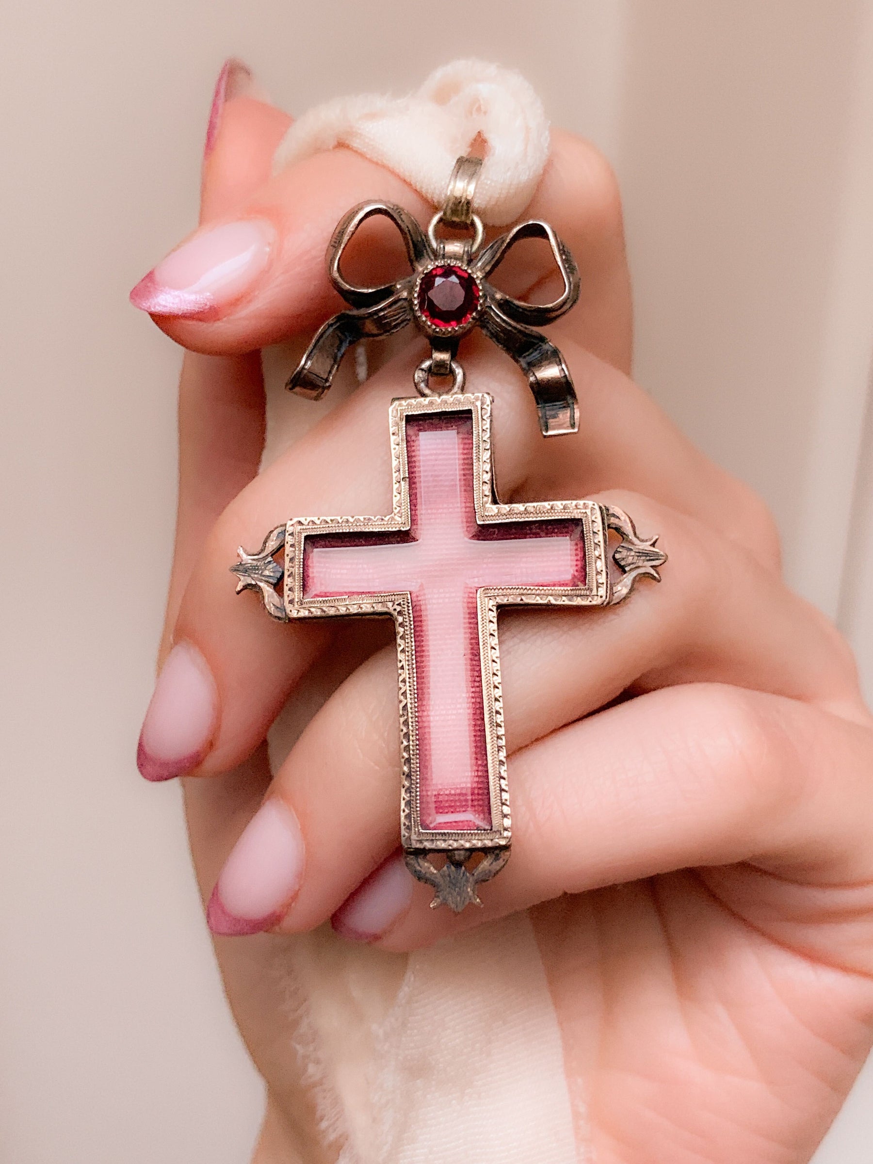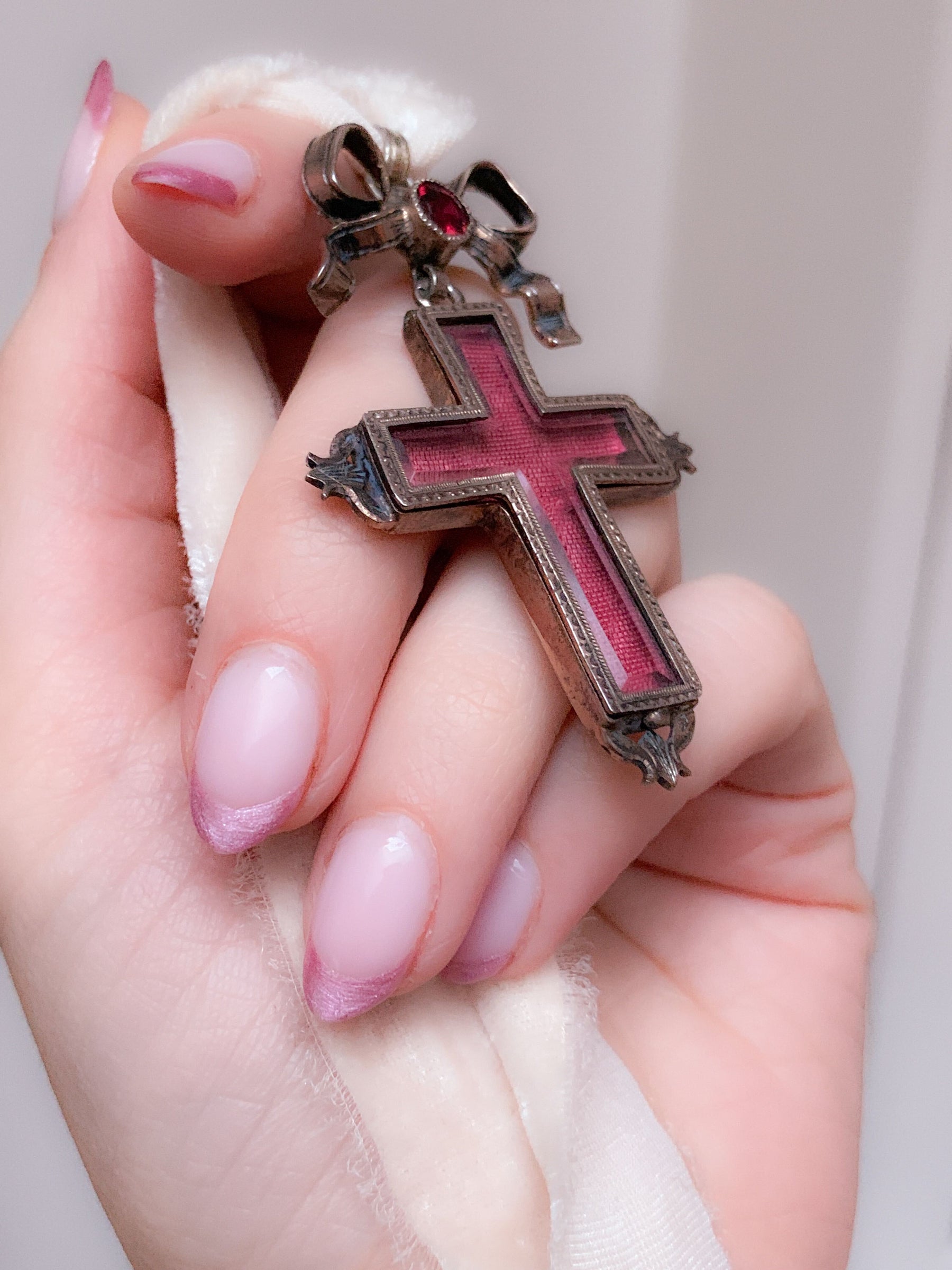 A reliquary refers to an early locket created with the purpose of holding a religious relic. These often took the form of a pendant so that the relic could be worn and displayed at all times. An outstanding example with a very special bezeled locket face, a piece of reliquary fabric was lovingly fitted into the front of this beautiful cross with etched backing.