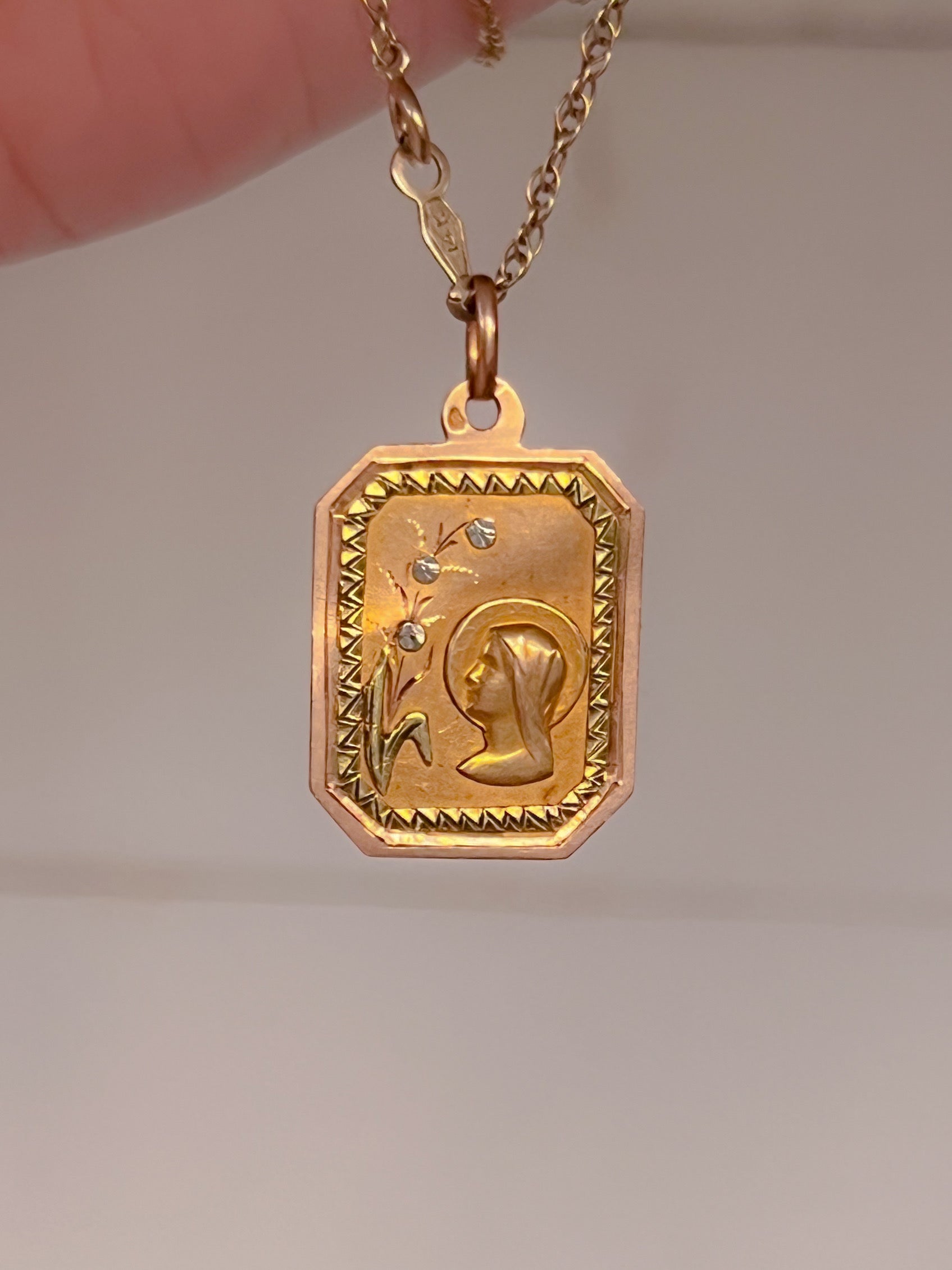 A gorgeous rectangular Mother Mary Medallion in 18ct with lilies on the face and the mother presented with a halo. This gorgeous example is likely from the 1920's and in excellent shape.