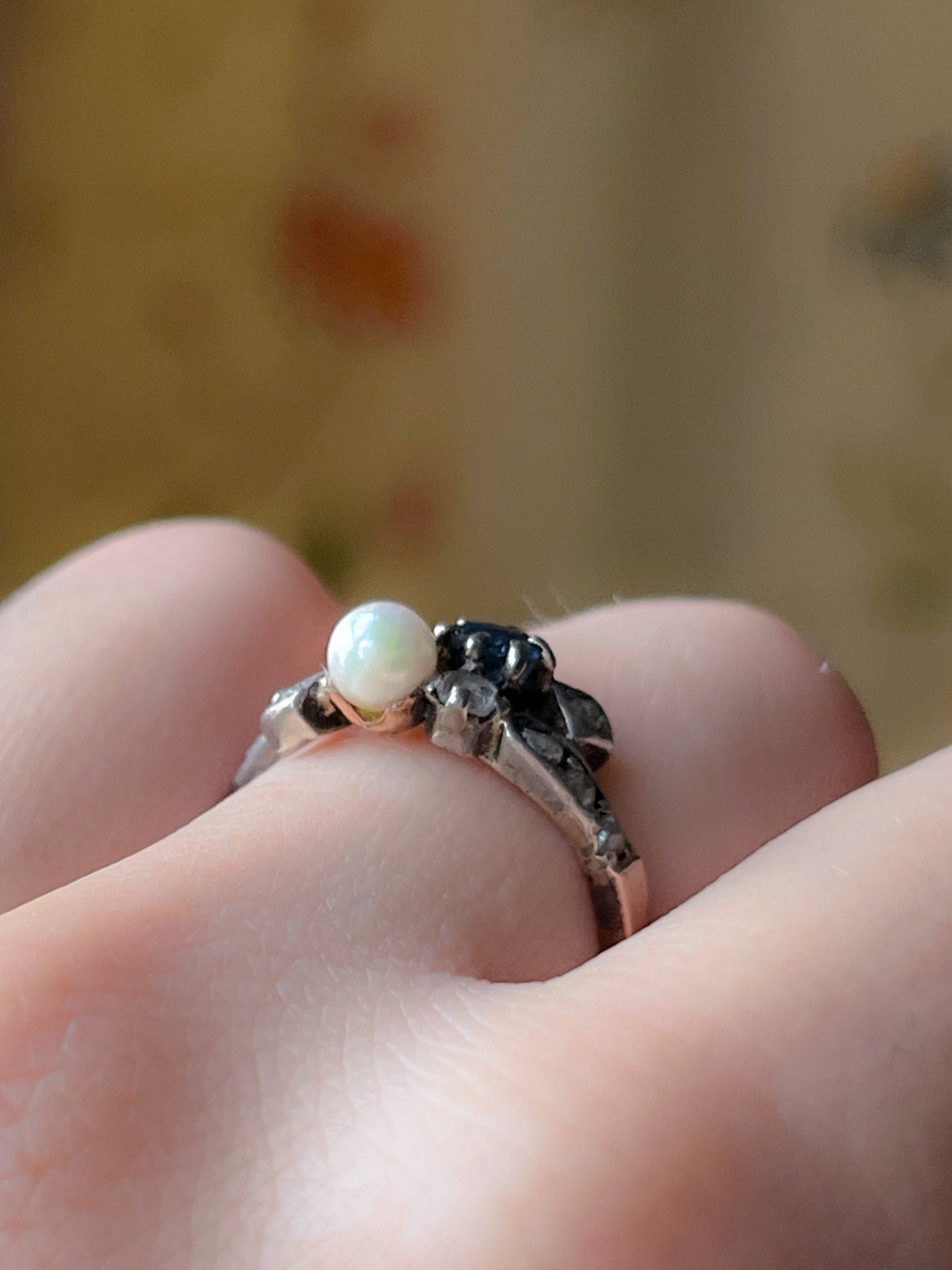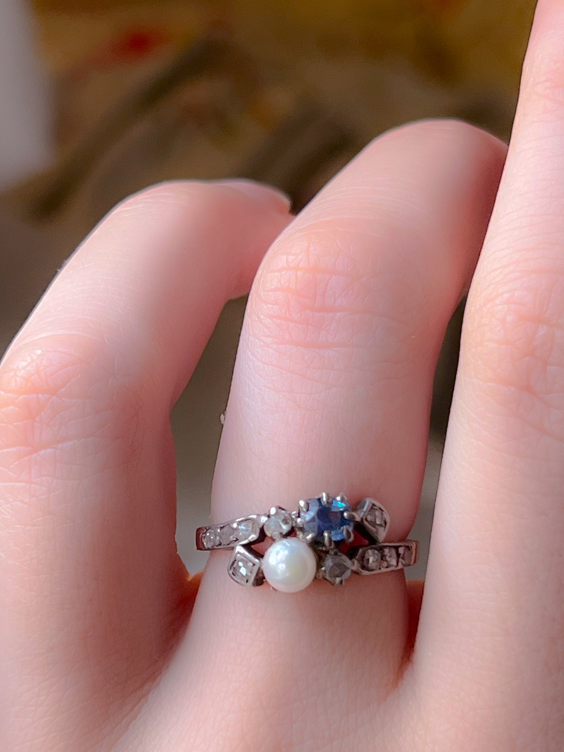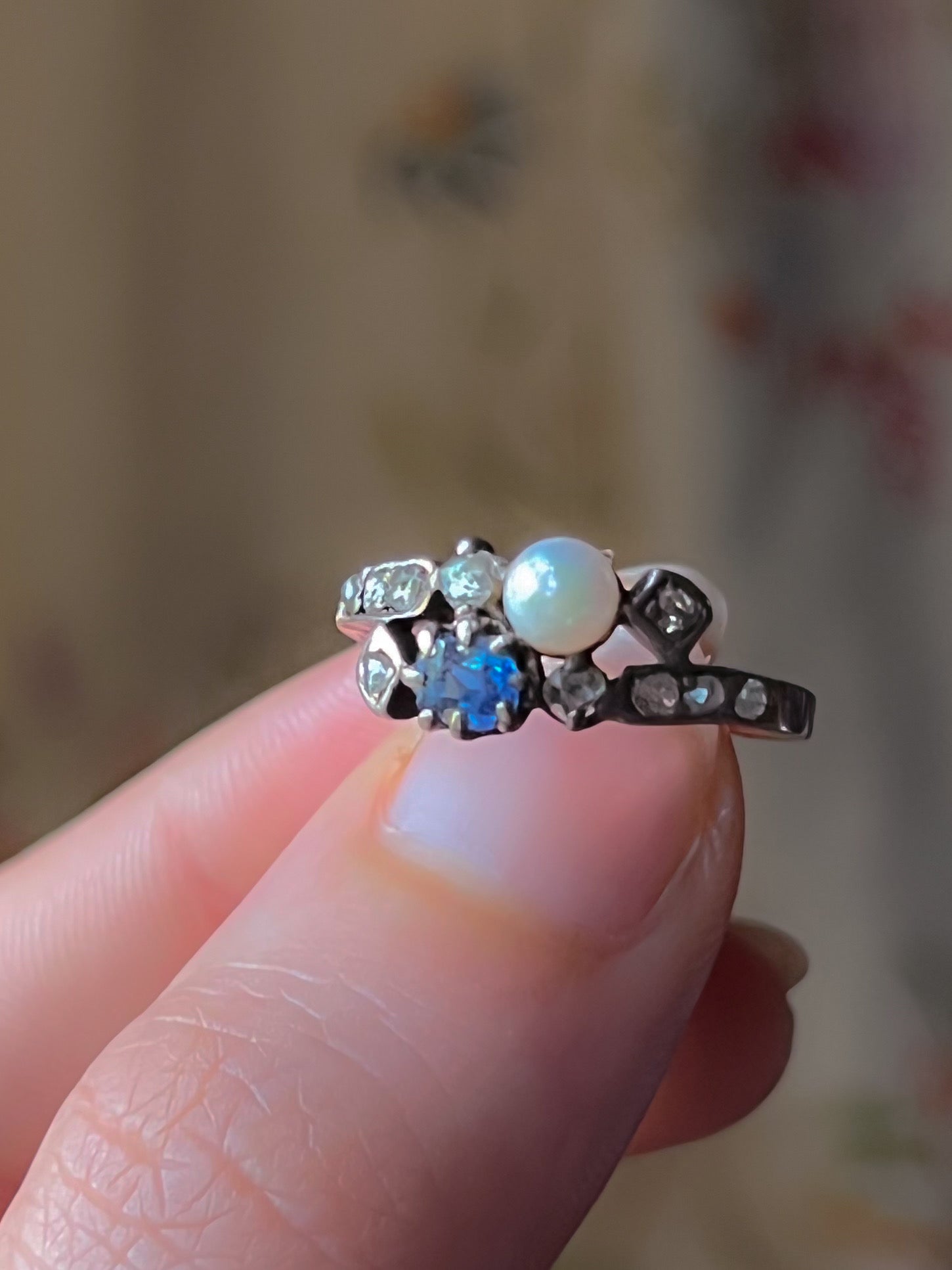 Nostalgia for the Middle Ages and the Italian/French Renaissance brought back a renewed interest in the symbolic powers of gemstones, especially toward the end of the 19th century, in Europe and the US. Rings were commonly made to celebrate birth stones and add subtle color to match a bride's eyes or temperament- sapphire has been a long beloved gemstone for its cool, watery tones. And from time to time, the French were persuaded to export some of their best examples, particularly in the ever-so-coveted pink tone that no one else could quite replicate. This gorgeous hallmarked sapphire and pearl band is a delicious example of that French, Napoleon III period craftspersonship in the genre of gem-forward finger rings.