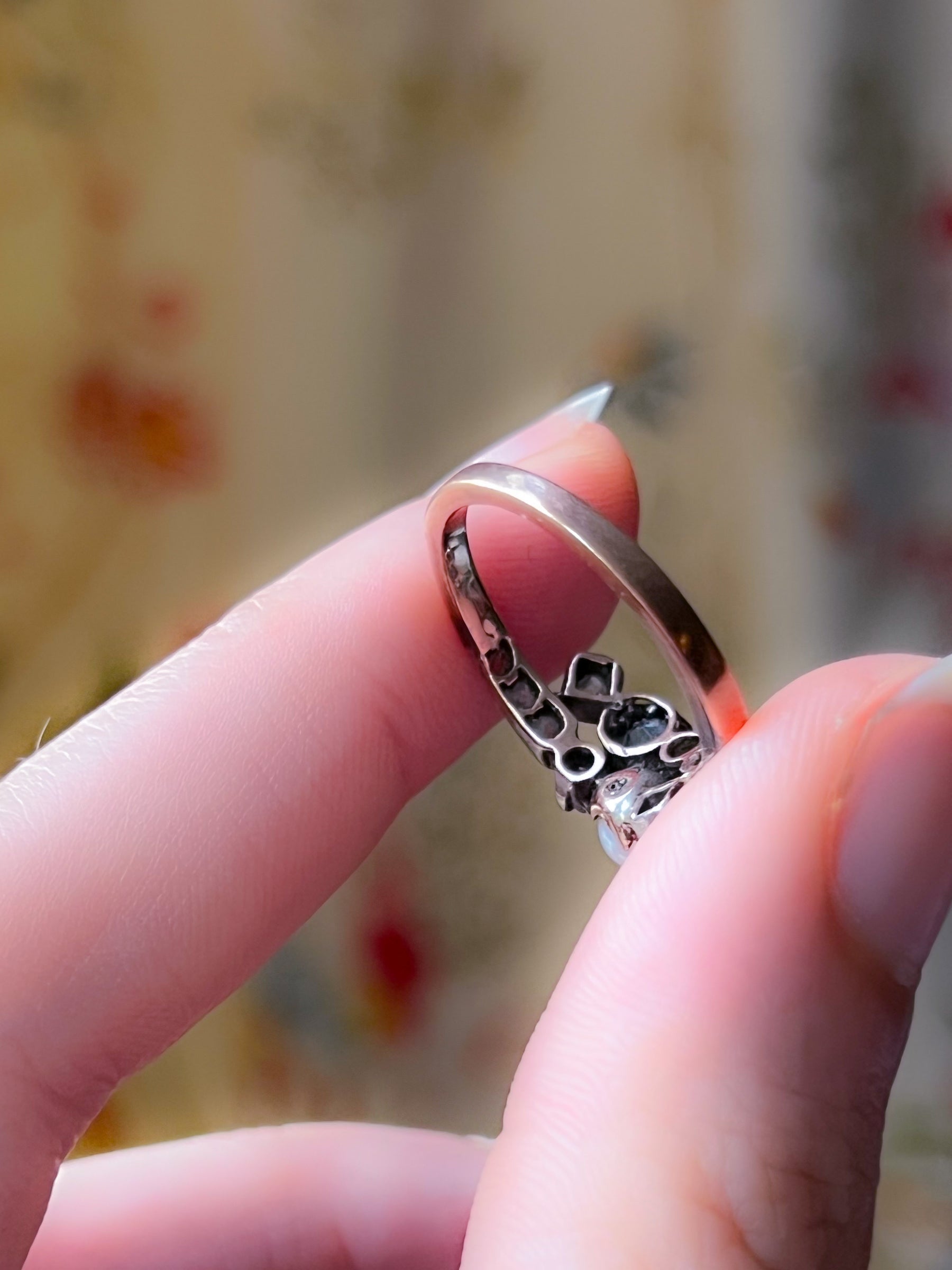 This ring benefits from rose cut diamonds, a delicate crossover form that was beloved in French jewelry at this time, and a generally excellent countenance on the finger- she stacks or can be worn solo!