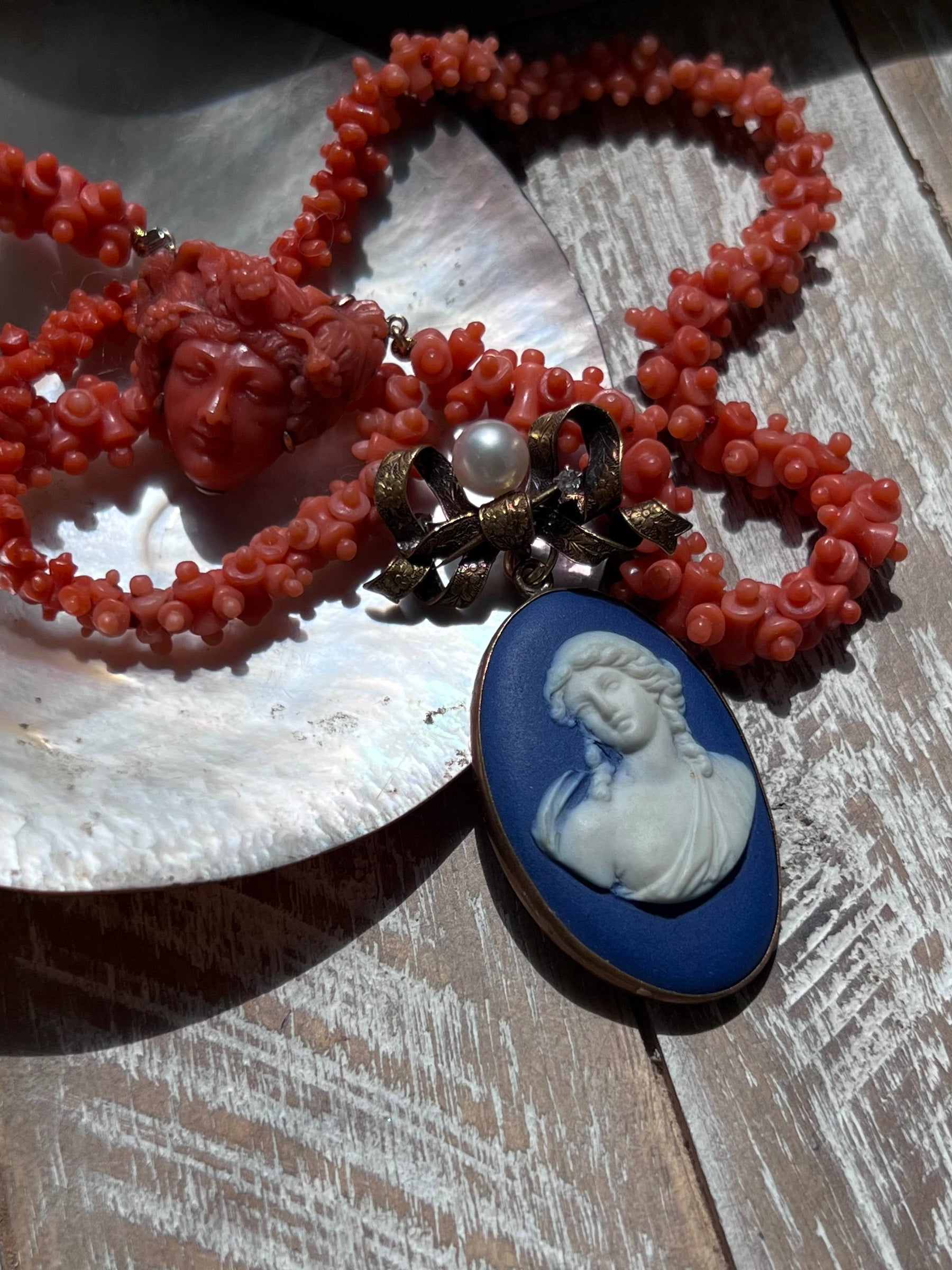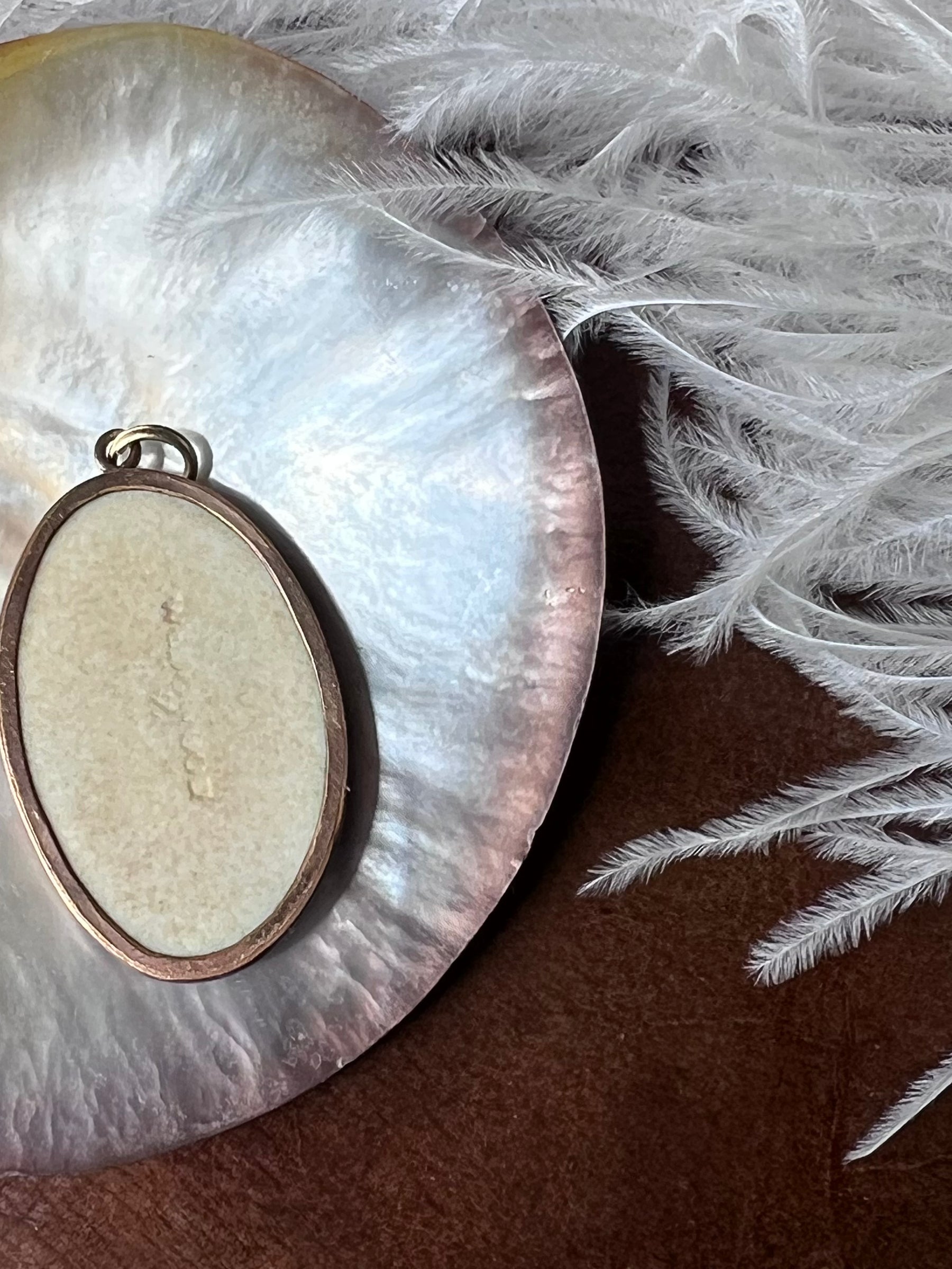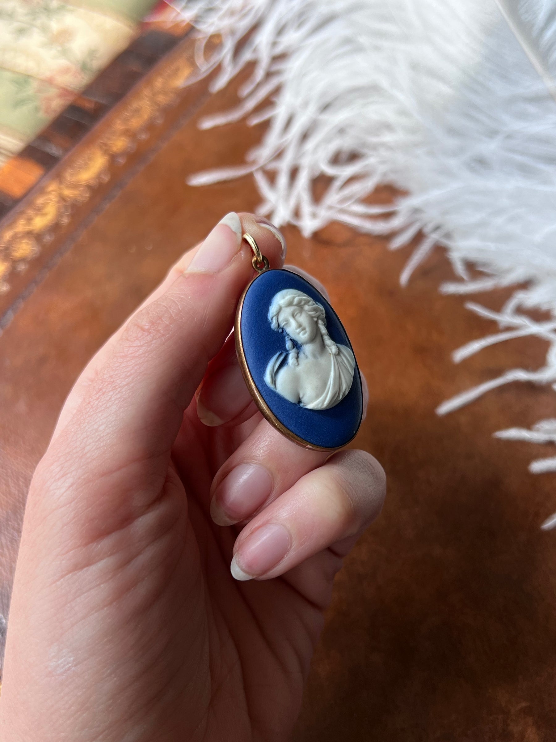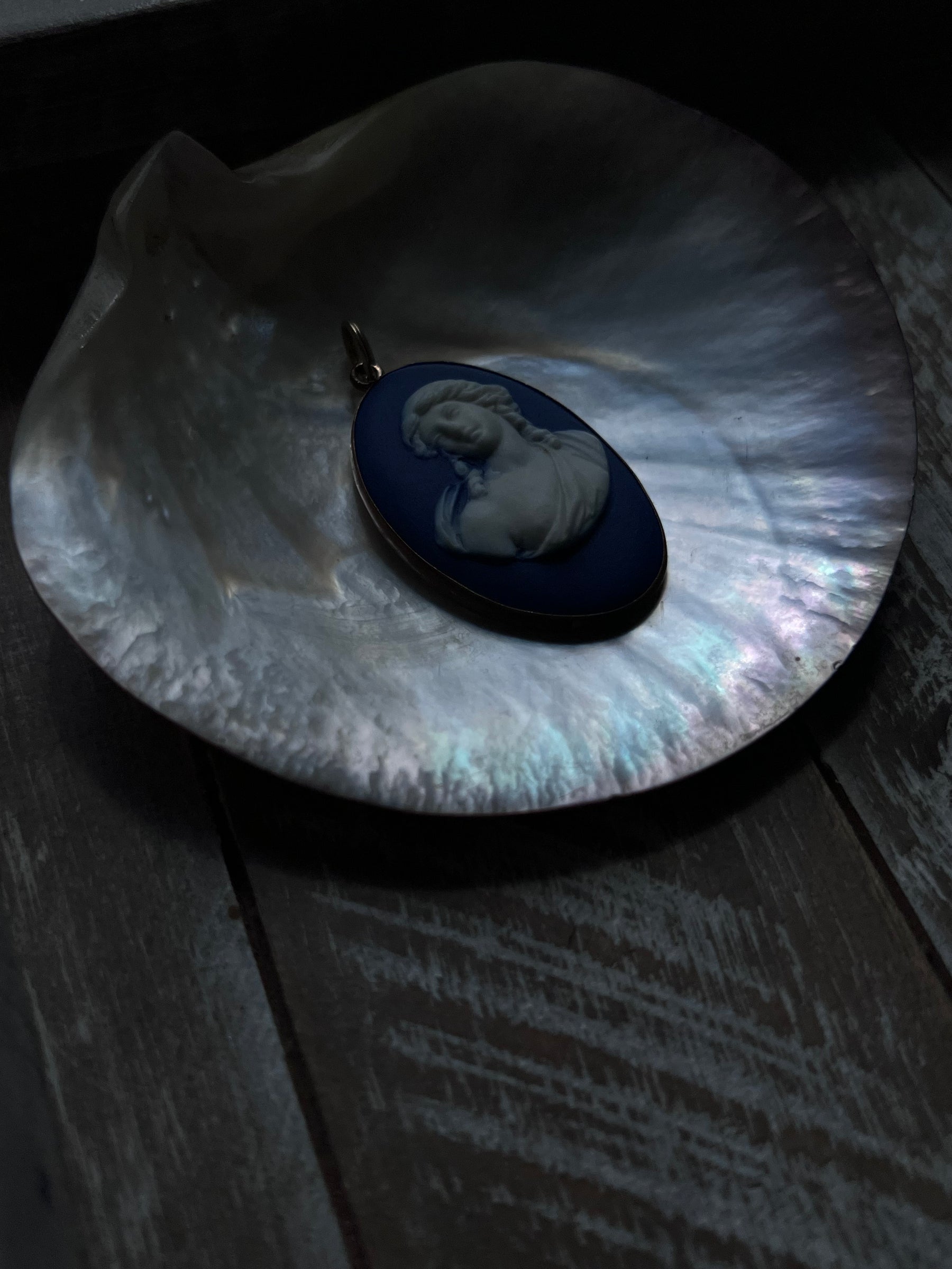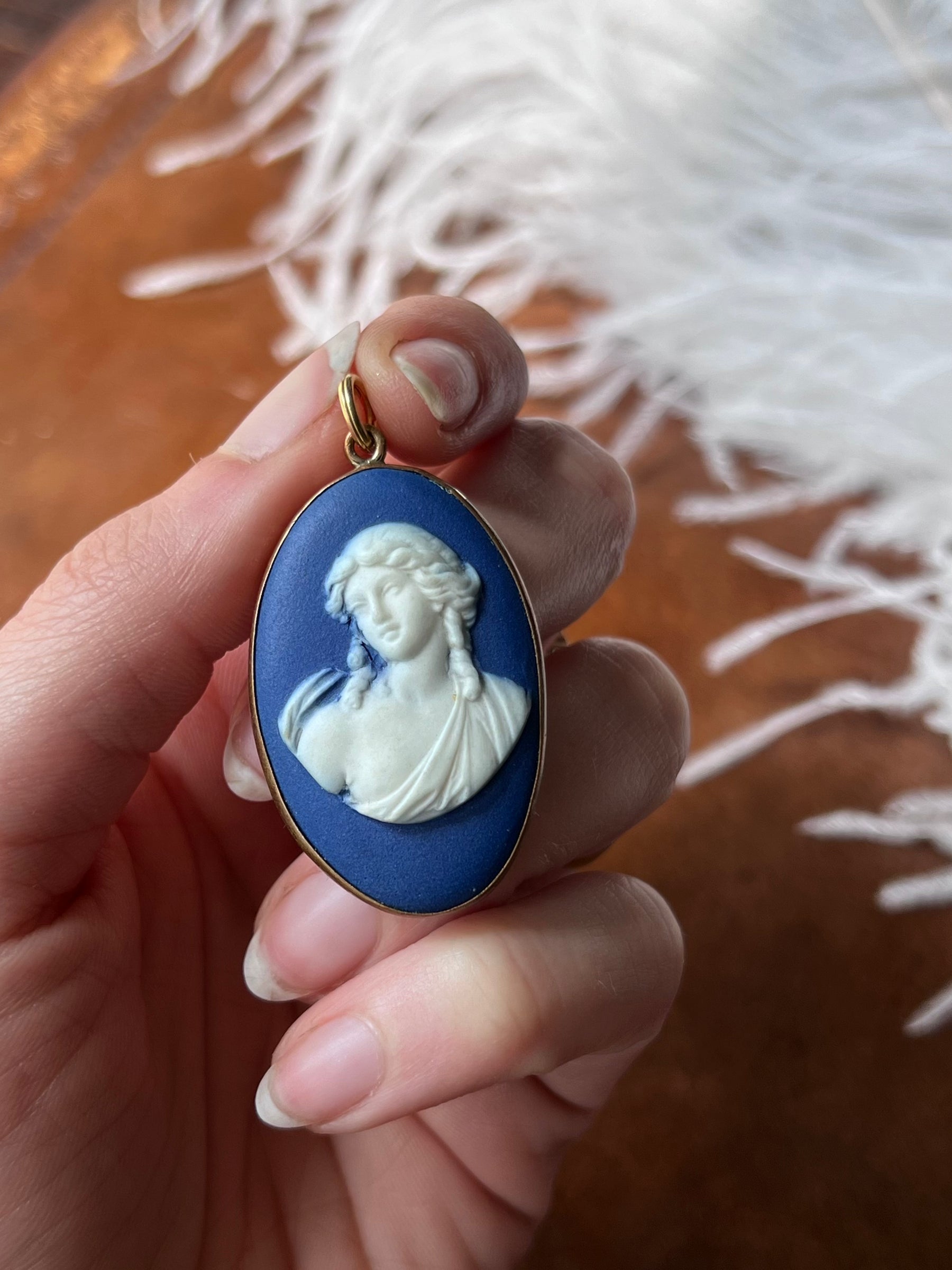 A very rare Georgian pendant featuring an early 19th century Wedgewood cameo of a woman, partially dishabilles, in  classical dress with flowing curls and an exposed breast. Of a great scale this cameo measures 2" with the top ring, and will be a remarked upon addition to any collection in her dramatic color, with split ring bale, as well!
