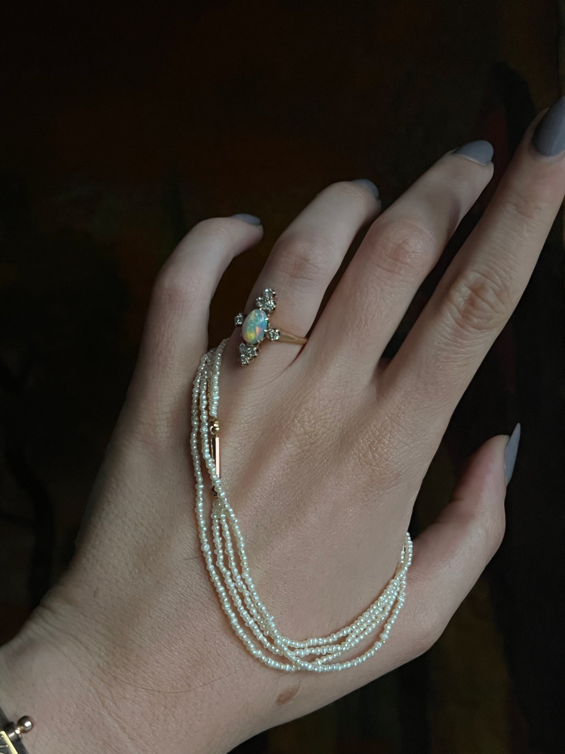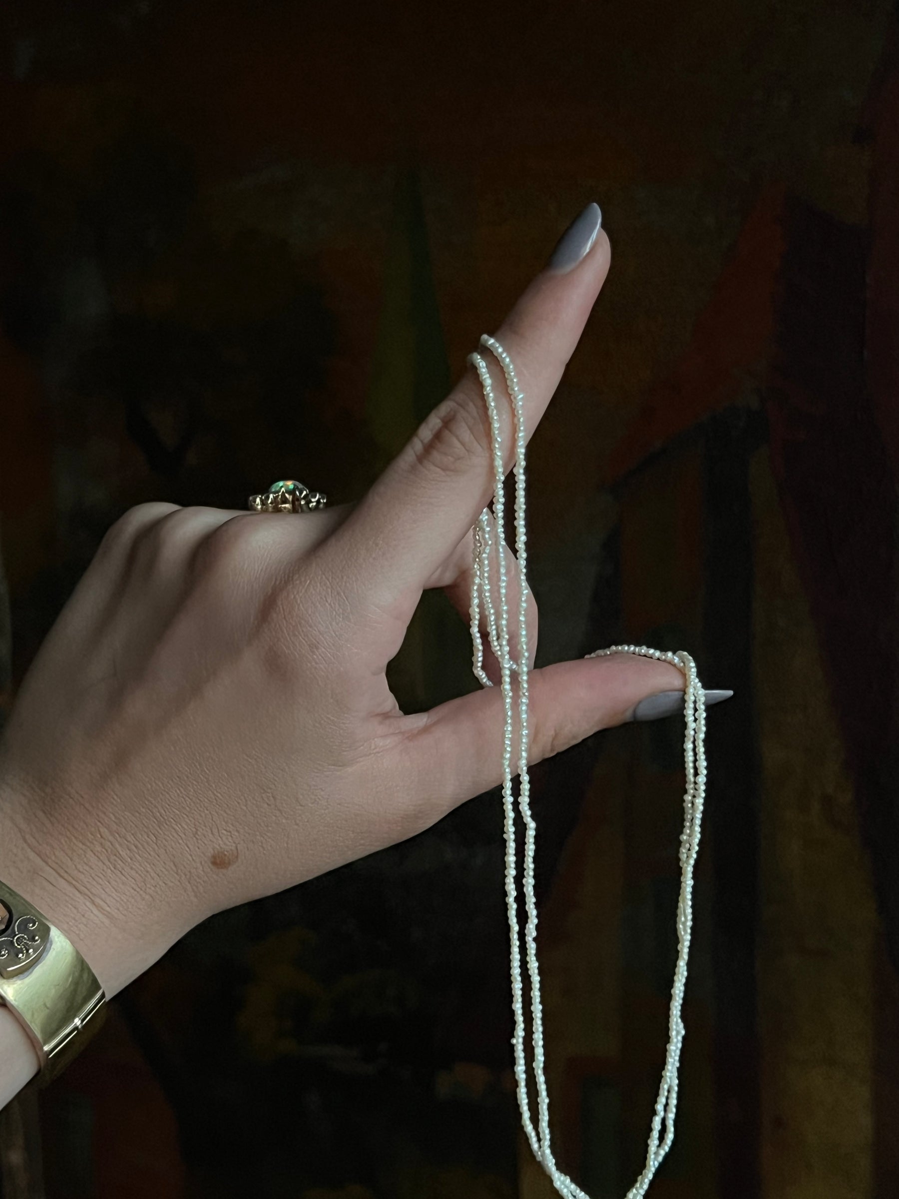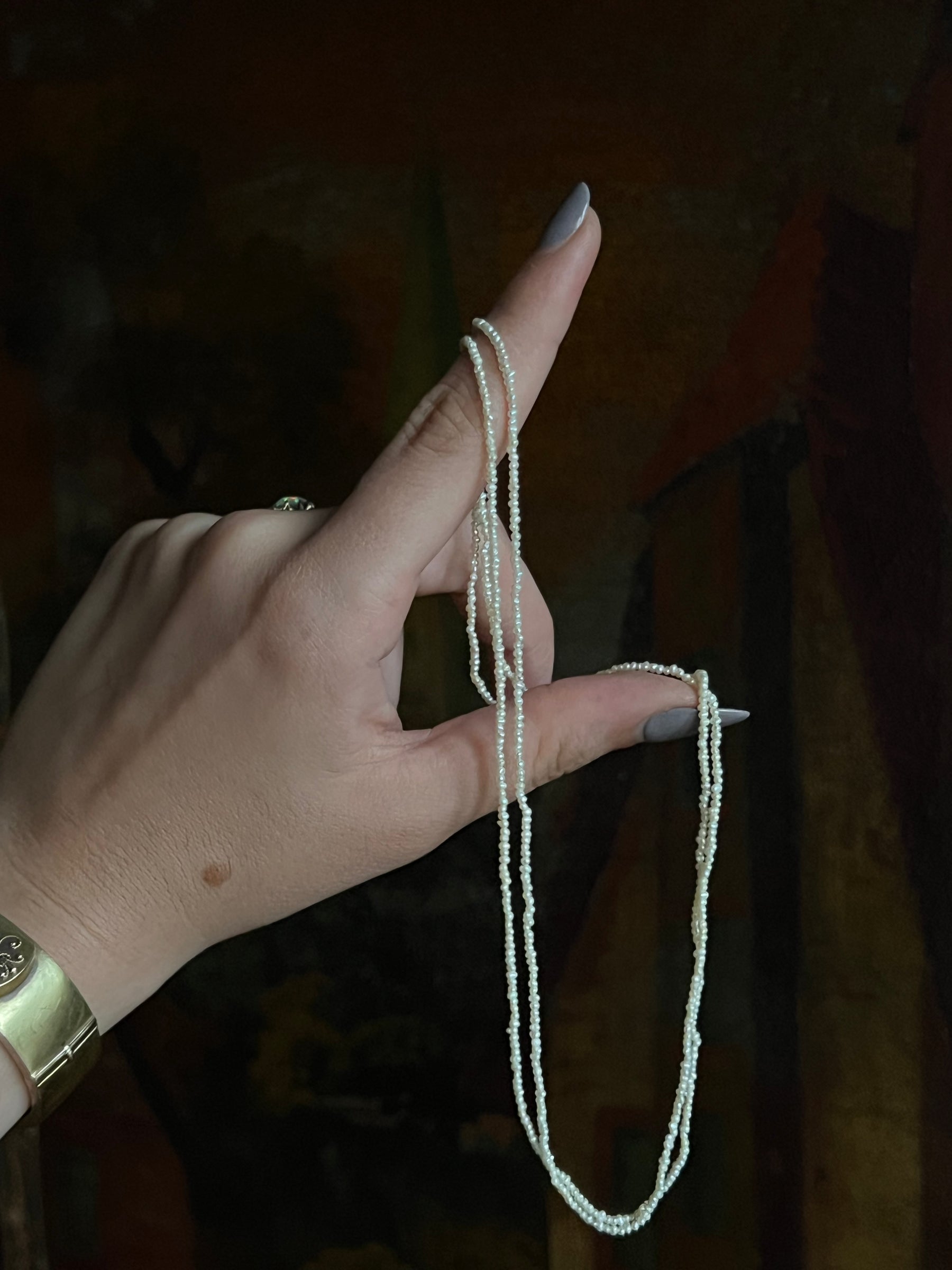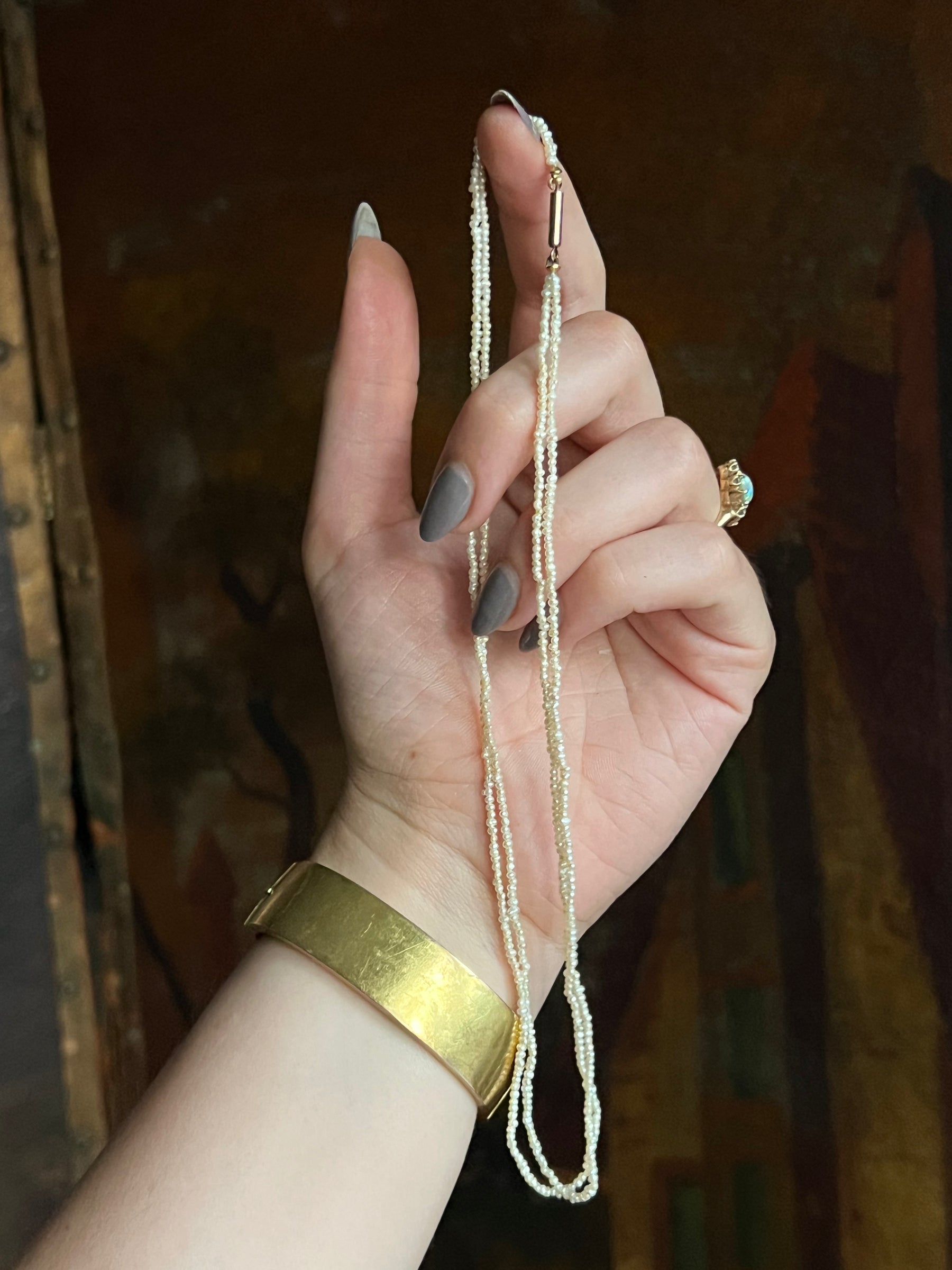 Materials and Features: Seed Pearls, 14ct barrel clasp
