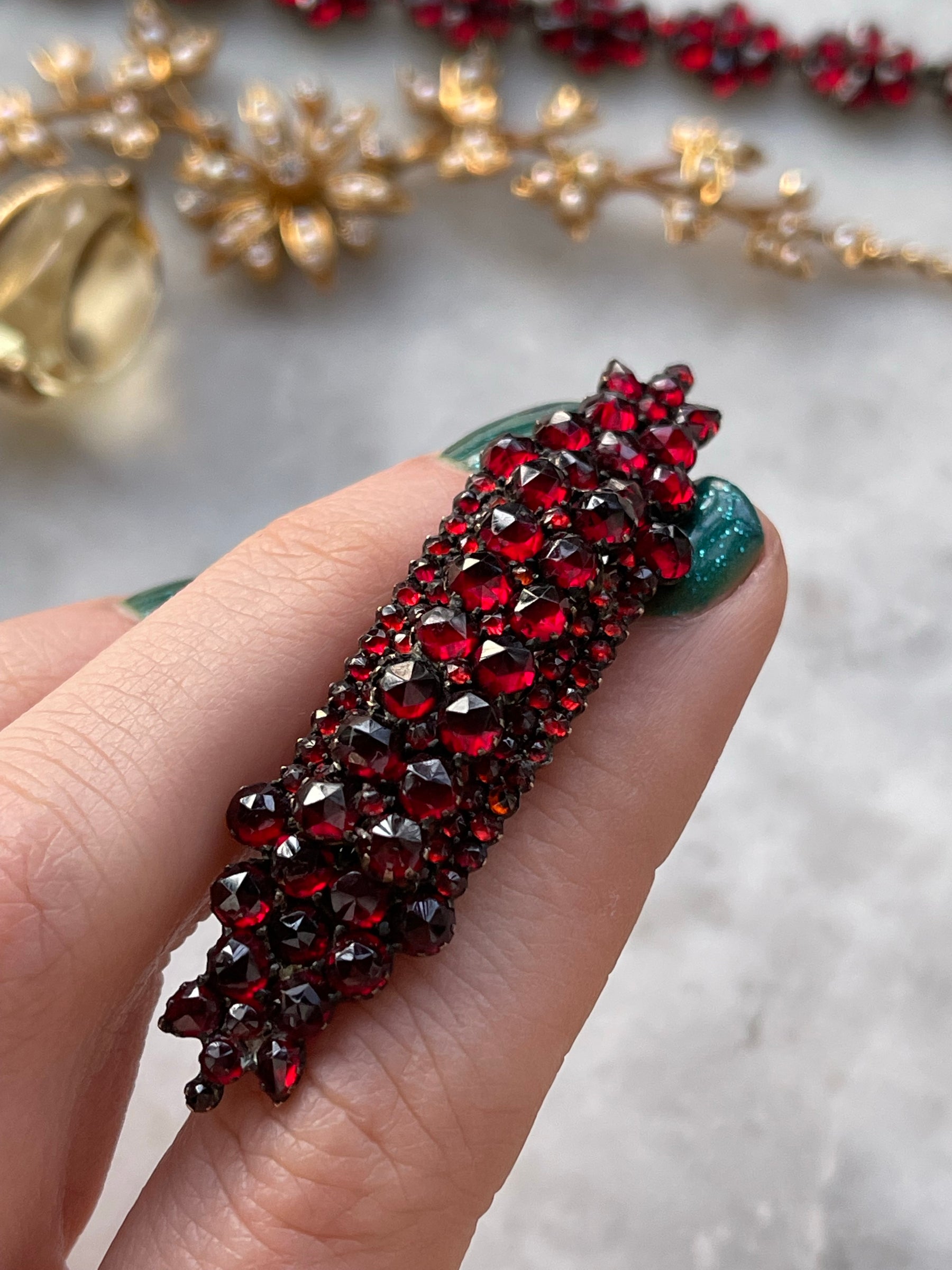 This beautiful barrette brooch is showered with nature with its garnet flowers atop, adding a stunning vibrance to any look. Wear it with an updo or your hair down - this treasure will stand out regardless.