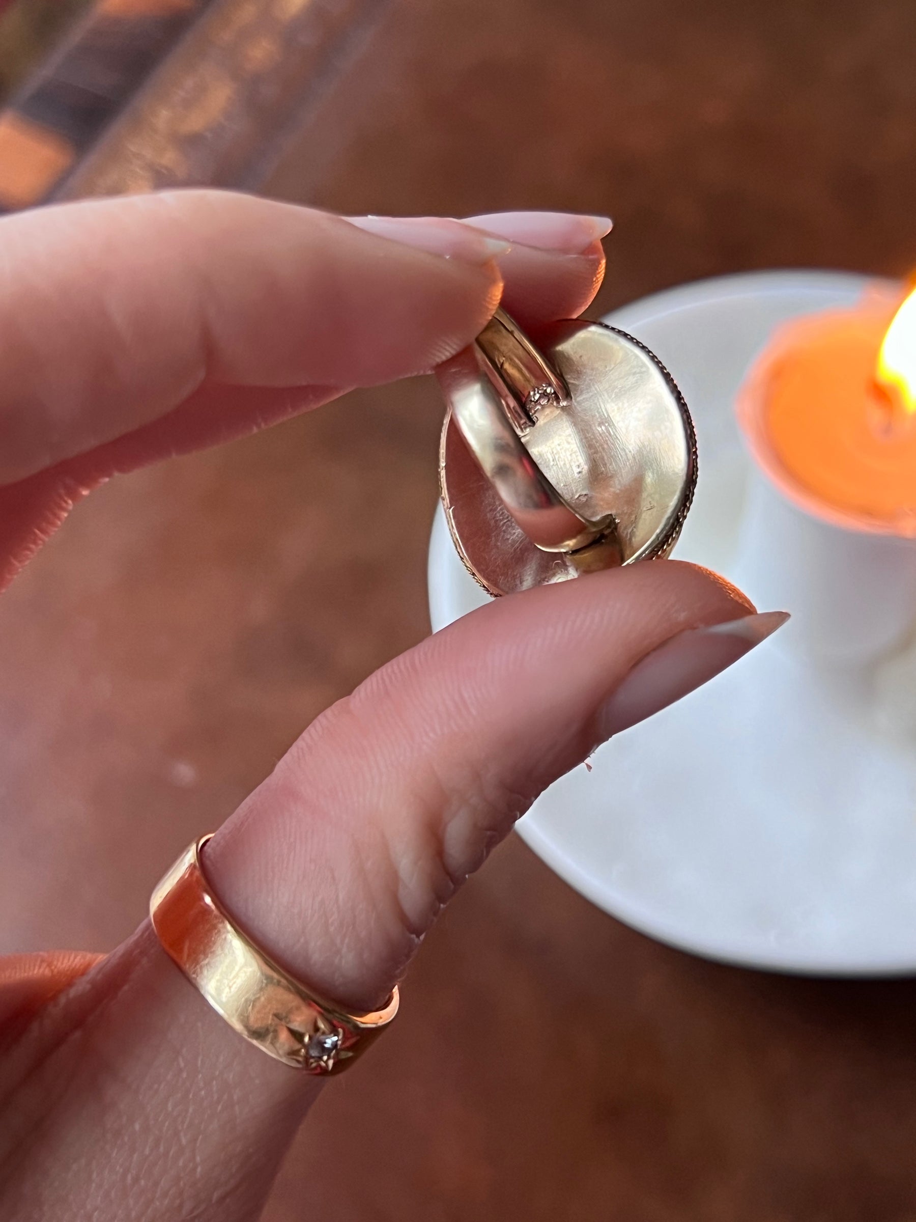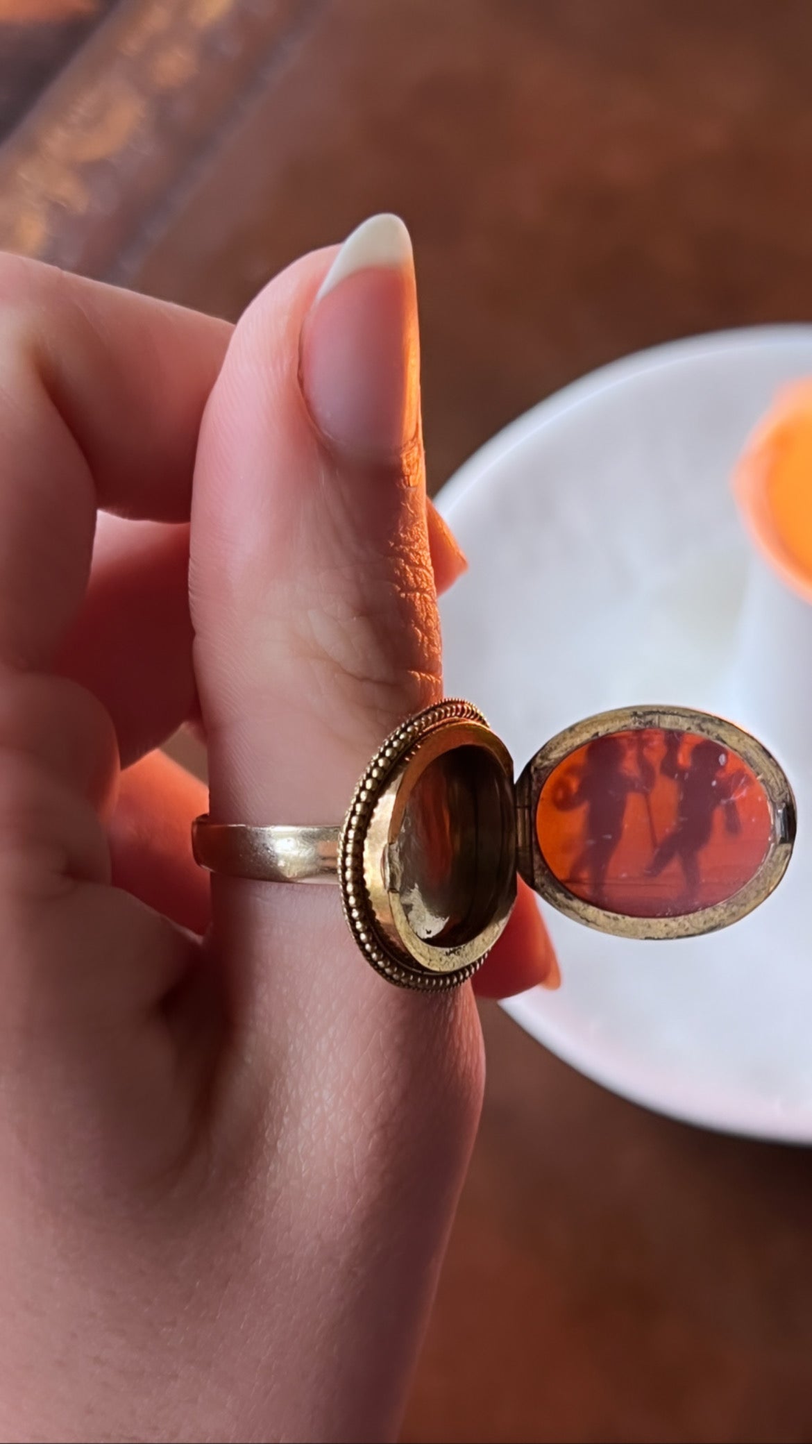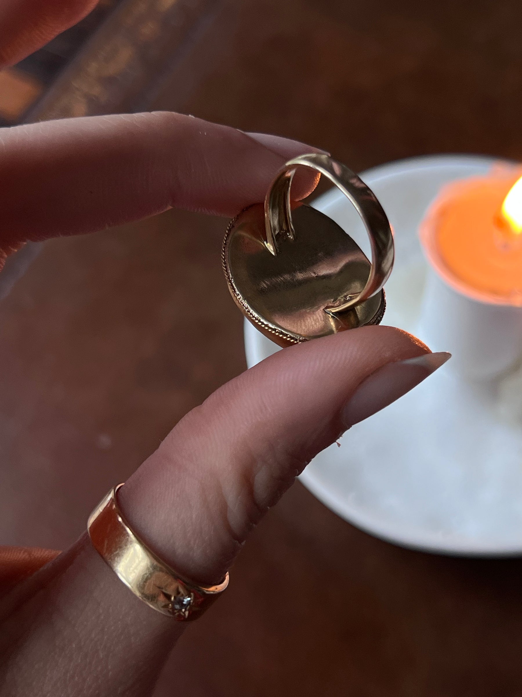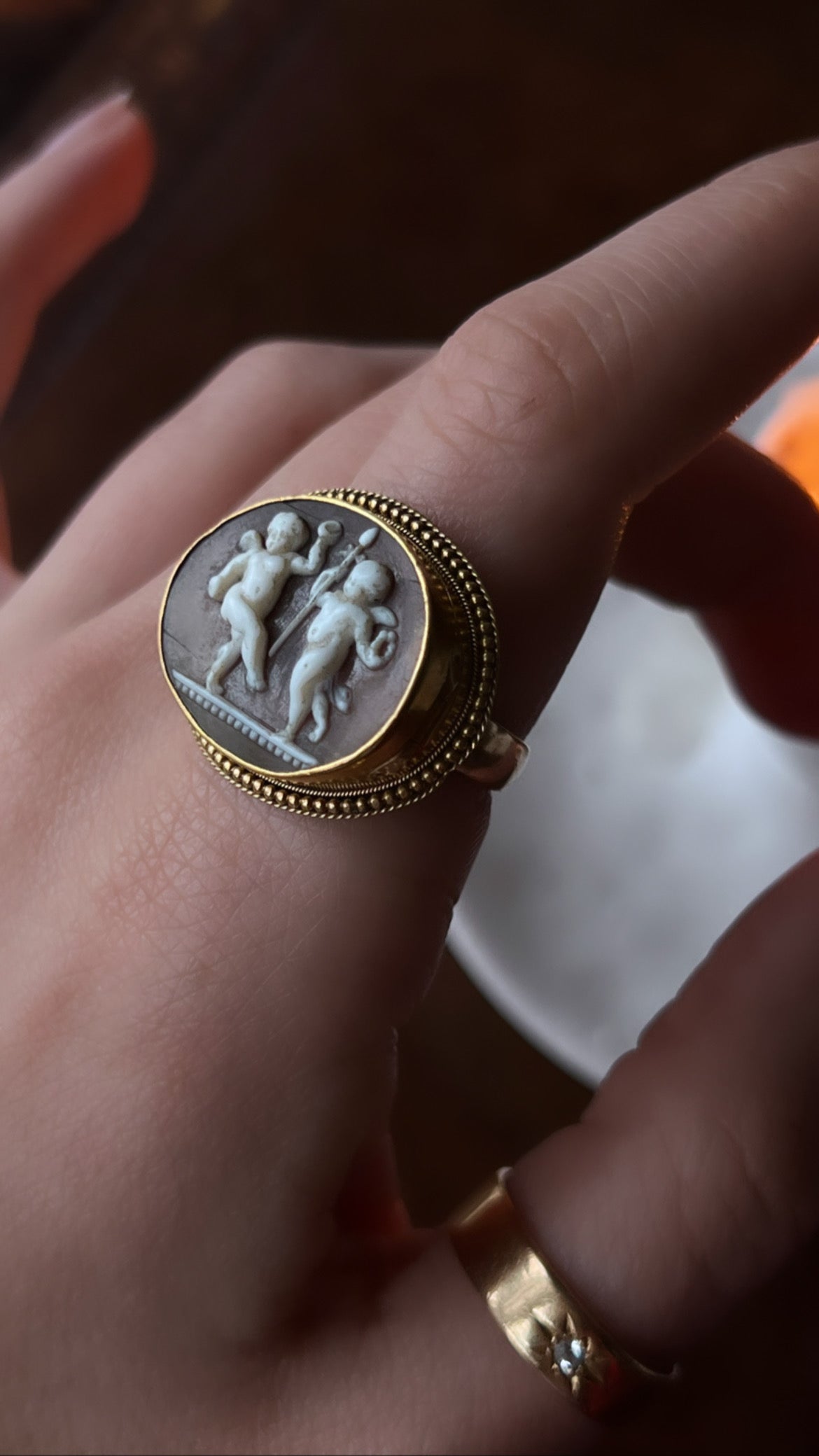 This is a marvelous cameo locket ring features a special cameo of brothers Cupid (the god of love) and Anteros (the god of requited love) playing together with whimsey. The closed-back, heavy gold original 15ct setting features a special locket compartment behind the cameo, to house whatever the wearer may like. At some point, this beautiful, highly carved romantic cameo was set with a shank. I couldn't be more fond of this rare find.