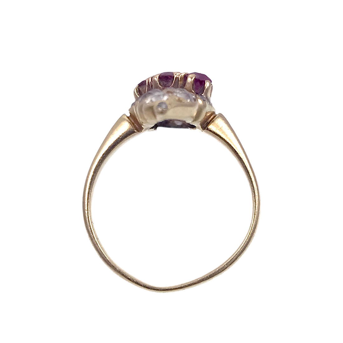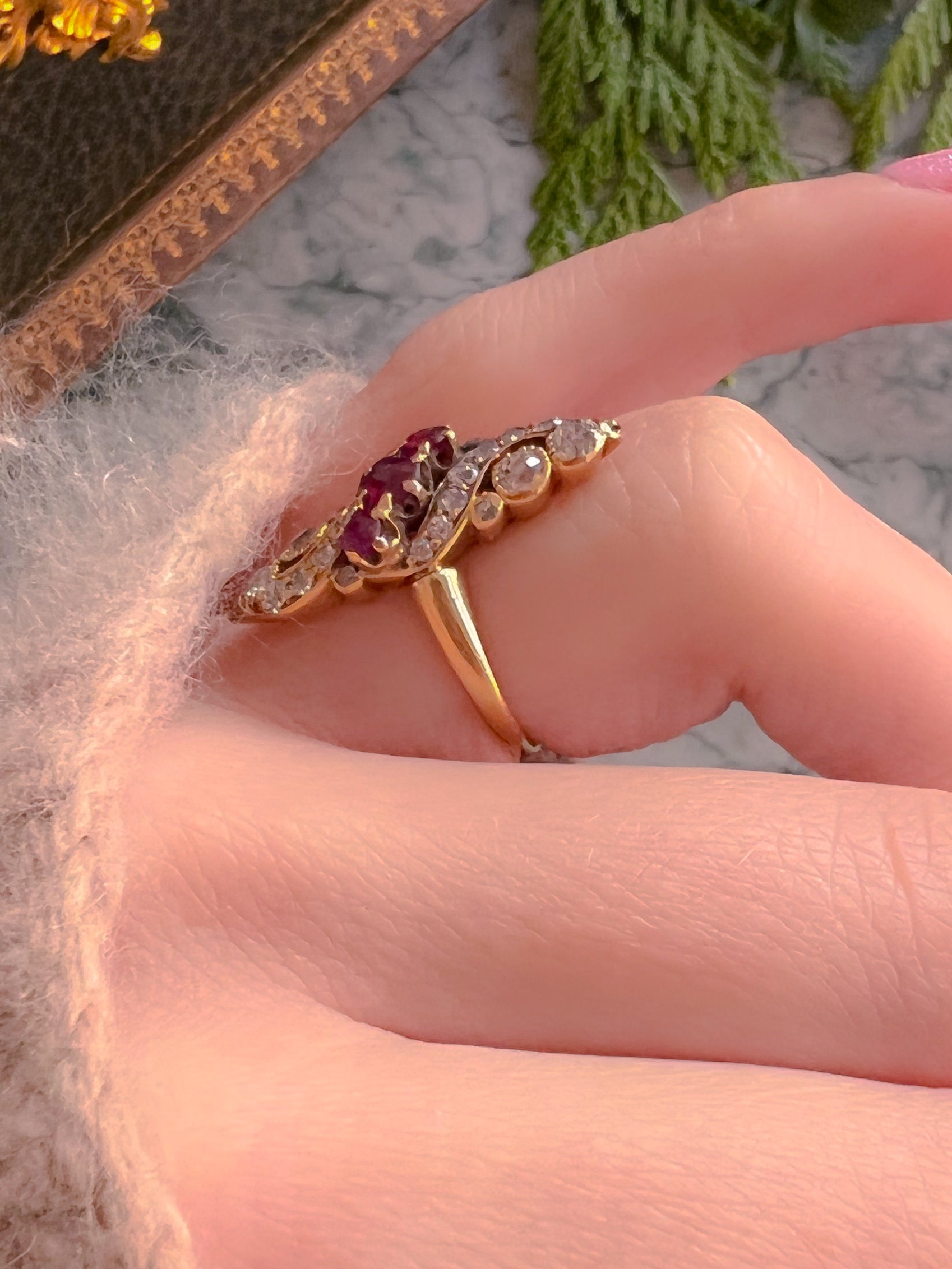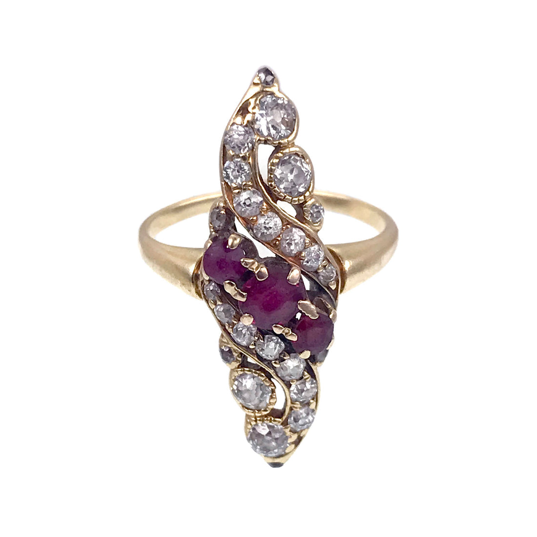 An exceptional victorian Navette ring with diamonds and rubies, in a stunning, swirling paisley- perfectly in line with Belle Époque sensibilities. It is becoming harder and harder to find Victorian diamond rings as so many were lost to time… and when we found this beauty with her sloping shoulders and bezeled old European diamonds, a collective hush fell over the office. We NEVER find them quite like this…