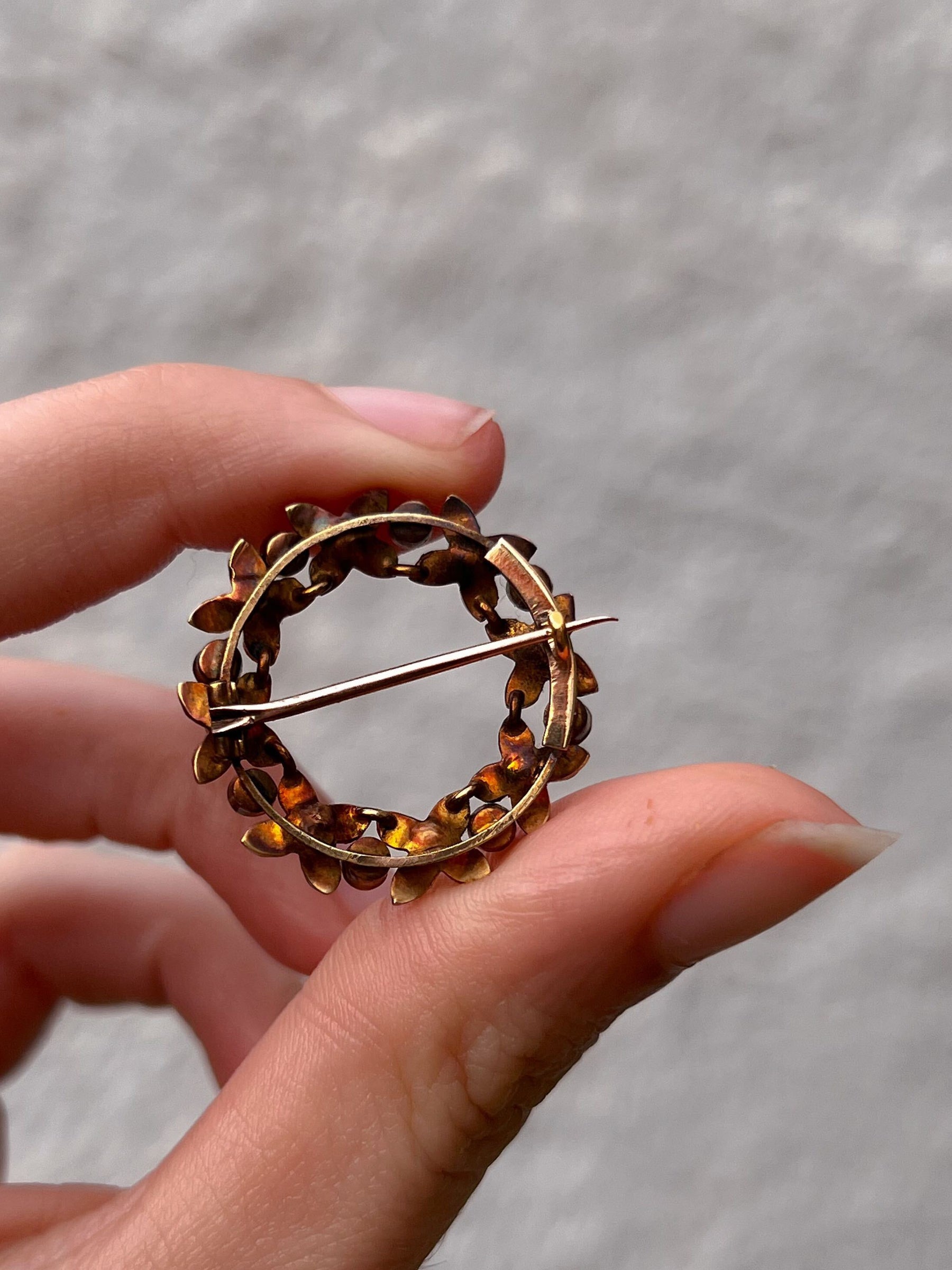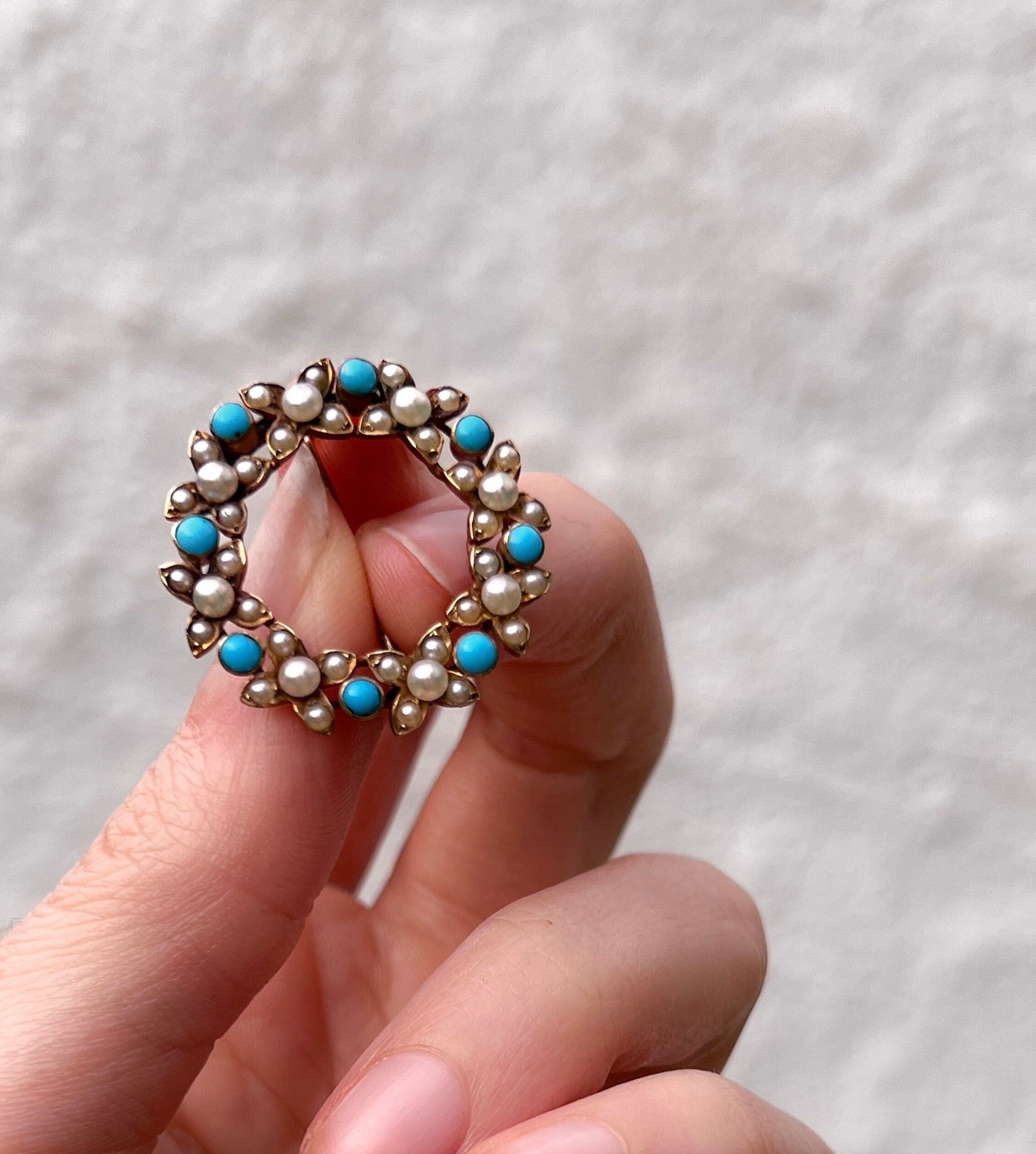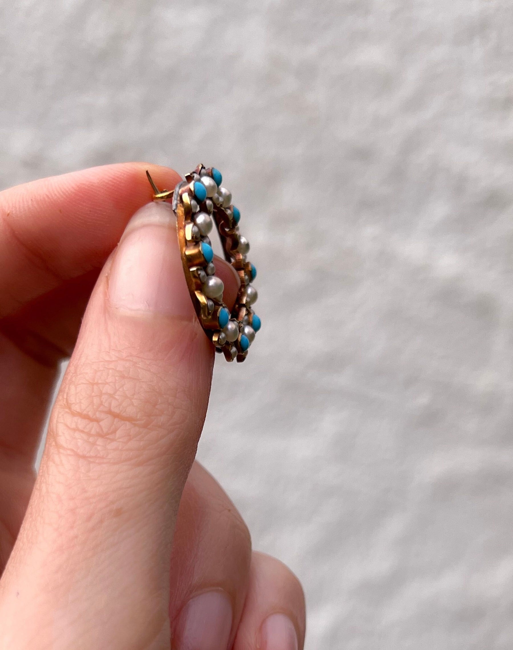 A beautiful, victorian 9k pearl flower wreath with bezel set turquoise cabochons, this darling brooch represents the cyclical nature of eternal love, with white blooms interspersed with that forget-me-not blue tone that we’ve come to so closely associate with the sentimentality of Victorian jewels. Perfect as a 1” chain extension, a collar stud, coat ornament, or really anywhere you love to sport your brooches.