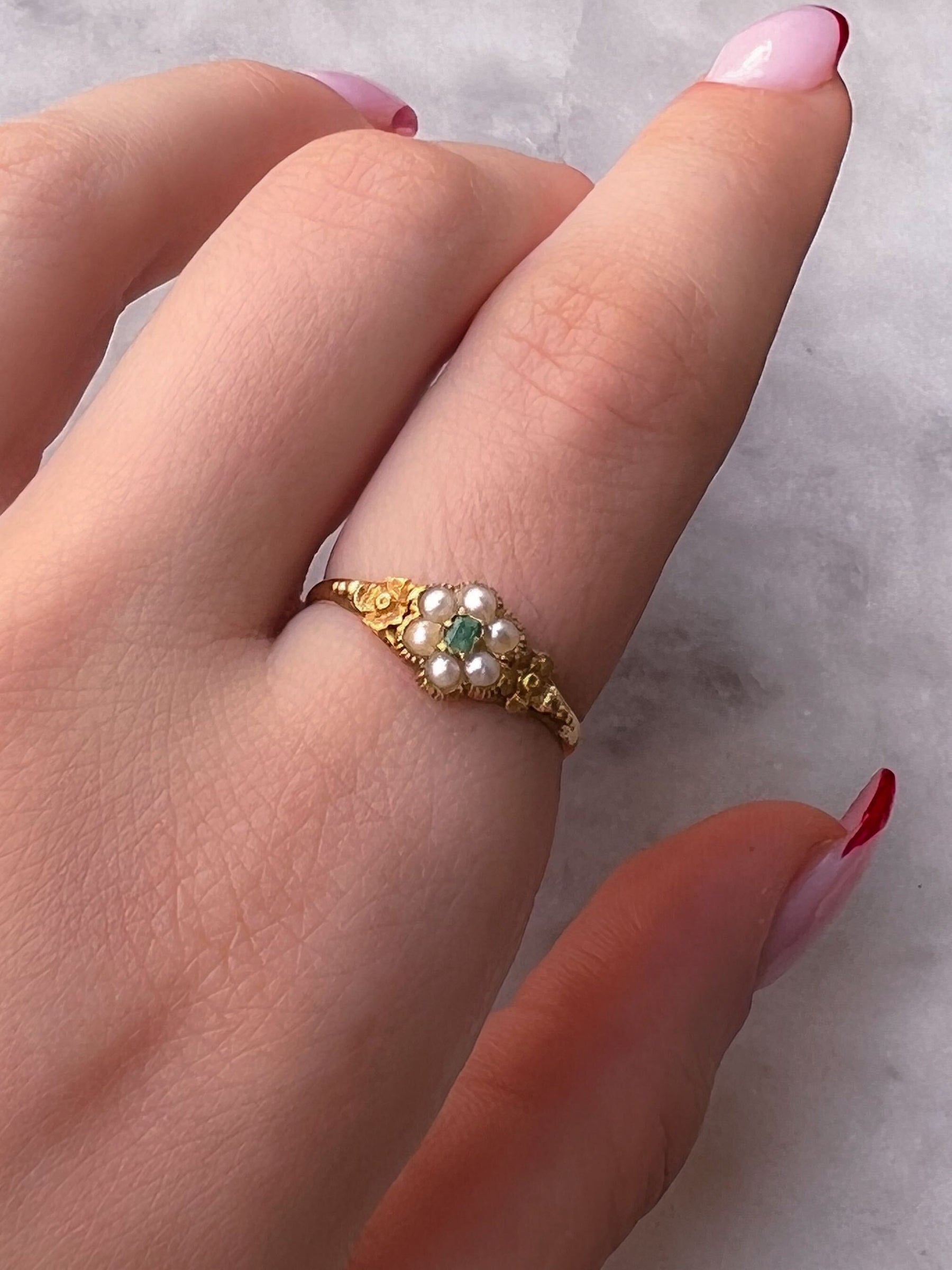 An extremely delicate early 19th-century example circa 1840, this ring is in excellent shape with a very detailed shank featuring two beautiful flowers on the shoulders.