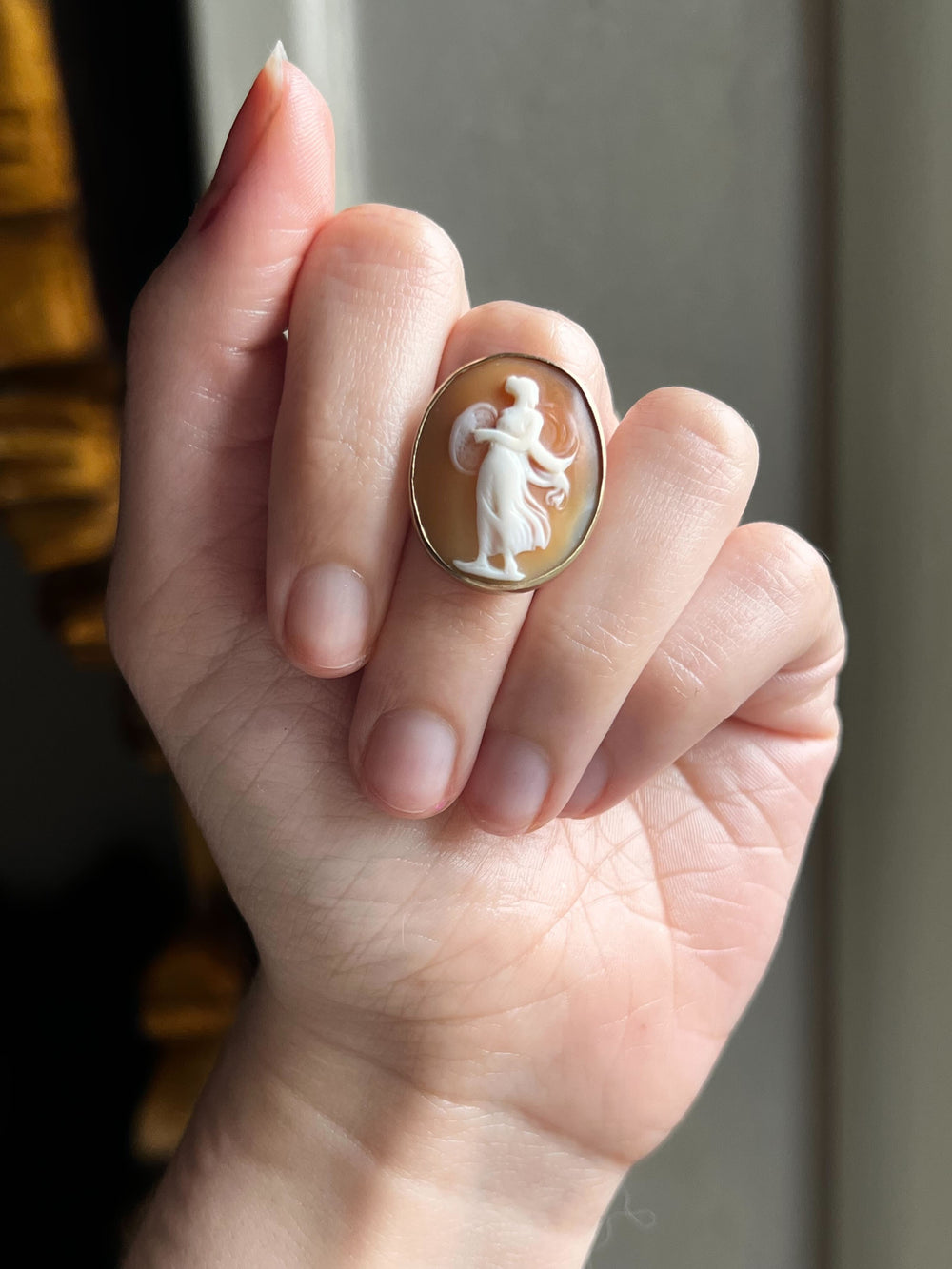 A stunning, bezel set cameo conversion ring featuring a side-facing figure among the gossamer billows of a greco-roman gown. English. This lovely conversion is set in 9k gold, circa 1890.
